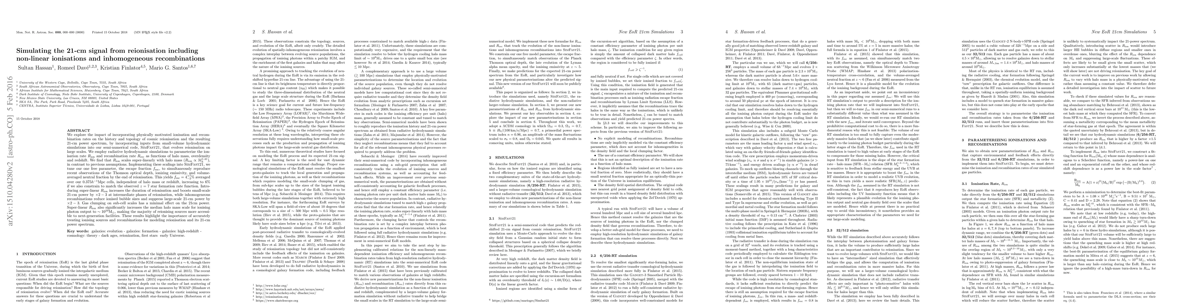 We explore the impact of incorporating physically motivated ionisation and recombination rates on the history and topology of cosmic reionisation, by incorporating inputs from small-volume hydrodynamic simulations into a semi-numerical code, SimFast21, that evolves reionisation on large scales. We employ radiative hydrodynamic simulations to parameterize the ionisation rate Rion and recombination rate Rrec as functions of halo mass, overdensity and redshift. We find that Rion is super-linearly dependent on halo mass (Rion ~ Mh^1.41), in contrast to previous assumptions. We implement these scalings into SimFast21 to identify the ionized regions. We tune our models to be consistent with recent observations of the optical depth, ionizing emissivity, and neutral fraction by the end of reionisation. We require an average photon escape fraction fesc=0.04 within ~ 0.5 cMpc cells, independent of halo mass or redshift, to simultaneously match these data. We present predictions for the 21cm power spectrum, and show that it is converged with respect to simulation volume. We find that introducing superlinearly mass-dependent ionisations increases the duration of reionisation and boosts the small-scale 21cm power by ~ 2-3 at intermediate phases of reionisation. Introducing inhomogeneous recombinations reduces ionised bubble sizes and suppresses large-scale 21cm power by ~ 2-3. Moreover, gas clumping on sub-cell scales has a minimal effect on the 21cm power, indicating that robust predictions do not depend on the behaviour of kpc-scale structures. The superlinear ionisations significantly increase the median halo mass scale for ionising photon output to >10^10 Mo, giving greater hope for detecting most of ionising sources with next-generation facilities. These results highlight the importance of more accurately treating ionising sources and recombinations for modeling reionisation and its 21cm signal.