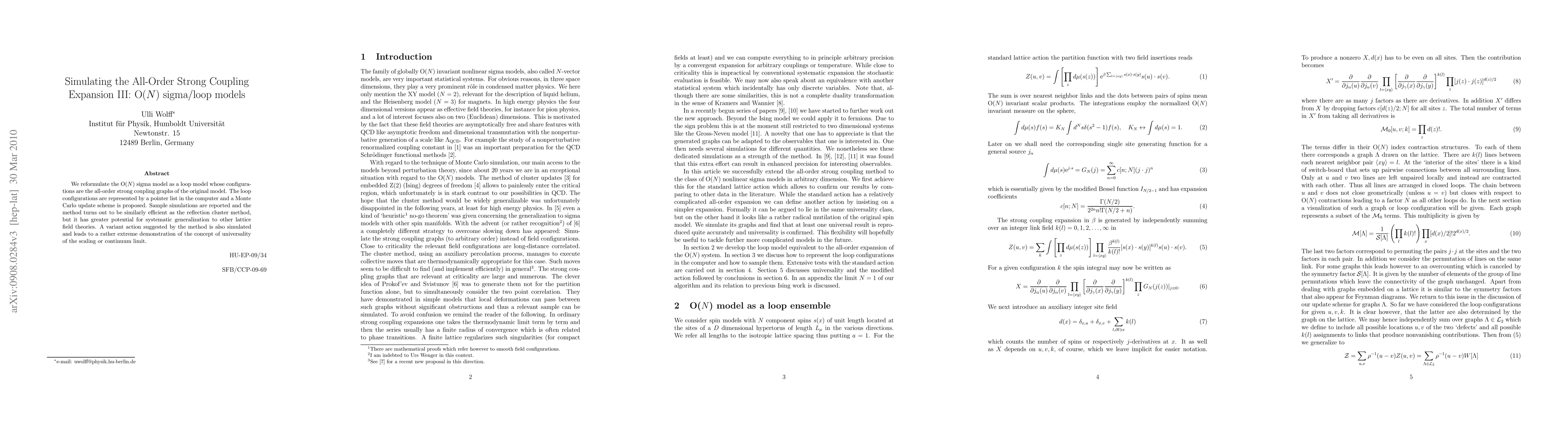 This paper reformulates the O(N) sigma model as a loop model, representing configurations as all-order strong coupling graphs, and proposes a Monte Carlo update scheme. Simulations show the method's efficiency comparable to the reflection cluster method, with potential for broader lattice field theory applications and a demonstration of universality in scaling limits.