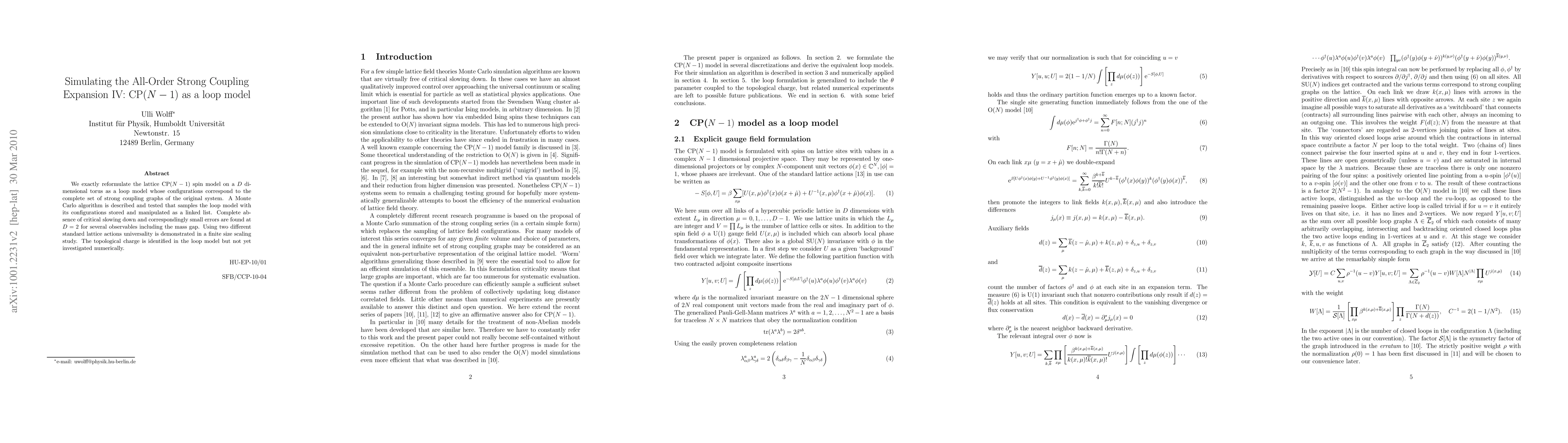 We exactly reformulate the lattice CP(N-1) spin model on a D dimensional torus as a loop model whose configurations correspond to the complete set of strong coupling graphs of the original system. A Monte Carlo algorithm is described and tested that samples the loop model with its configurations stored and manipulated as a linked list. Complete absence of critical slowing down and correspondingly small errors are found at D=2 for several observables including the mass gap. Using two different standard lattice actions universality is demonstrated in a finite size scaling study. The topological charge is identified in the loop model but not yet investigated numerically.