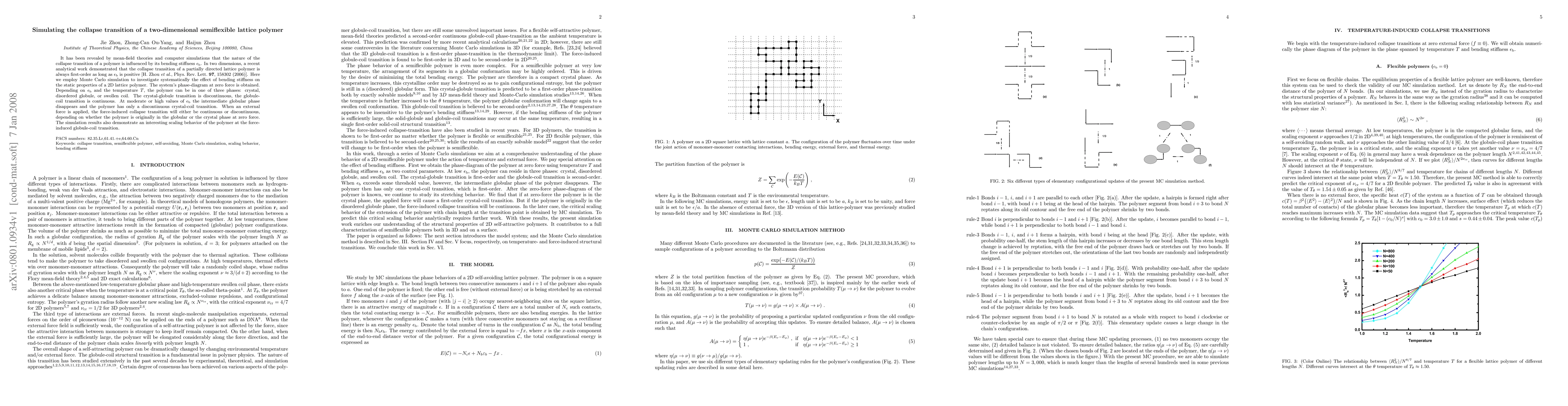 This paper uses Monte Carlo simulations to study the collapse transition of a two-dimensional semiflexible lattice polymer, revealing that the polymer's phase behavior depends on its bending stiffness and temperature, resulting in crystal, disordered globule, or swollen coil phases. The crystal-globule transition is first-order, while the globule-coil transition is continuous, with the polymer's response to external force also showing distinct transition behaviors.