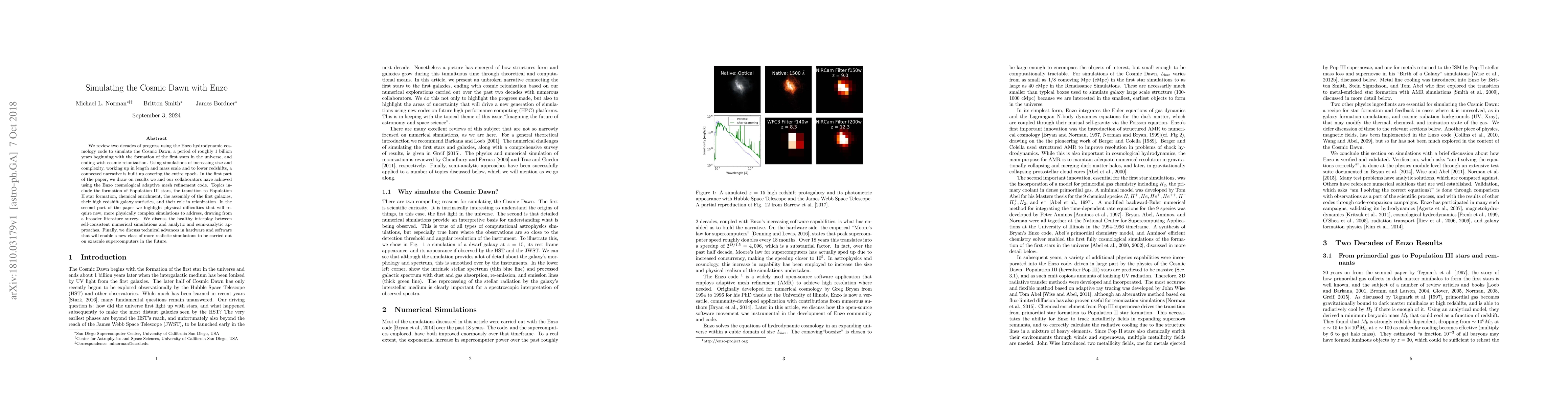 This paper reviews two decades of progress using the Enzo code to simulate the Cosmic Dawn, detailing the formation of the first stars and galaxies, and their role in cosmic reionization. It also highlights future challenges and technical advances needed for more realistic simulations on exascale supercomputers.