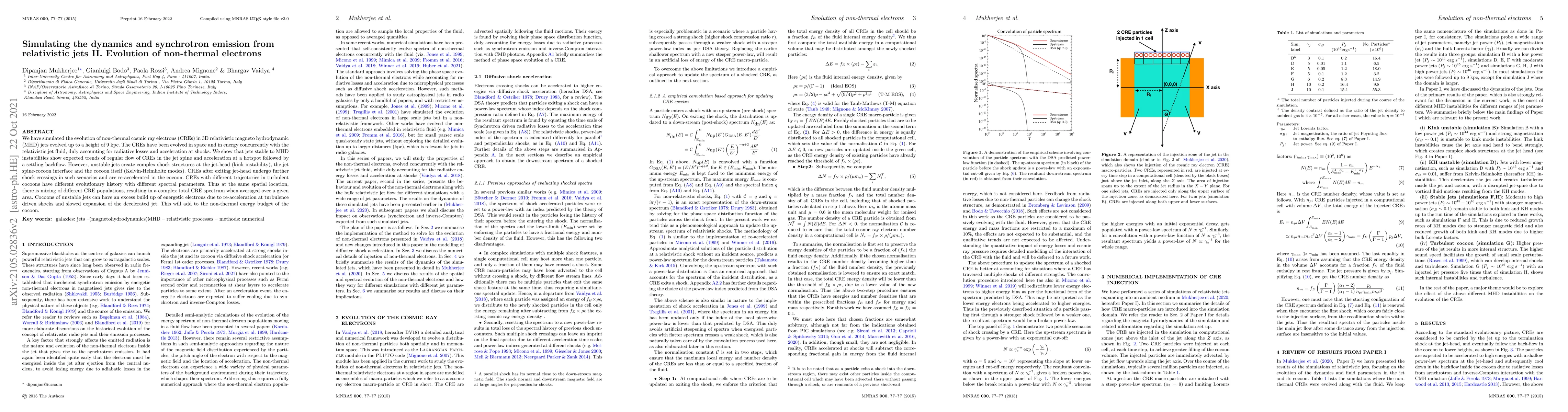 This paper simulates the evolution of non-thermal cosmic ray electrons in relativistic jets, showing that stable jets follow expected CRE flow and acceleration trends, while unstable jets create complex shock structures leading to re-acceleration and a mixed spectrum of CREs in the turbulent cocoon.