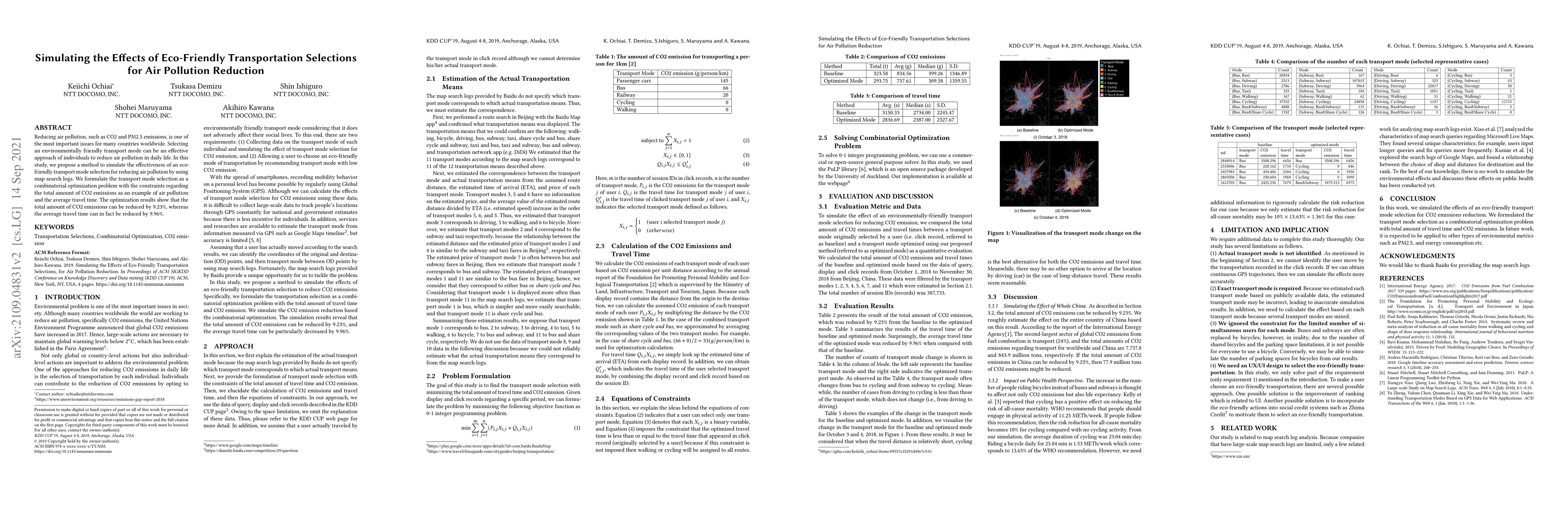 This study proposes a method to simulate the impact of eco-friendly transport choices on air pollution reduction using map search logs. The research demonstrates a 9.23% reduction in CO2 emissions and a 9.96% decrease in average travel time through combinatorial optimization.