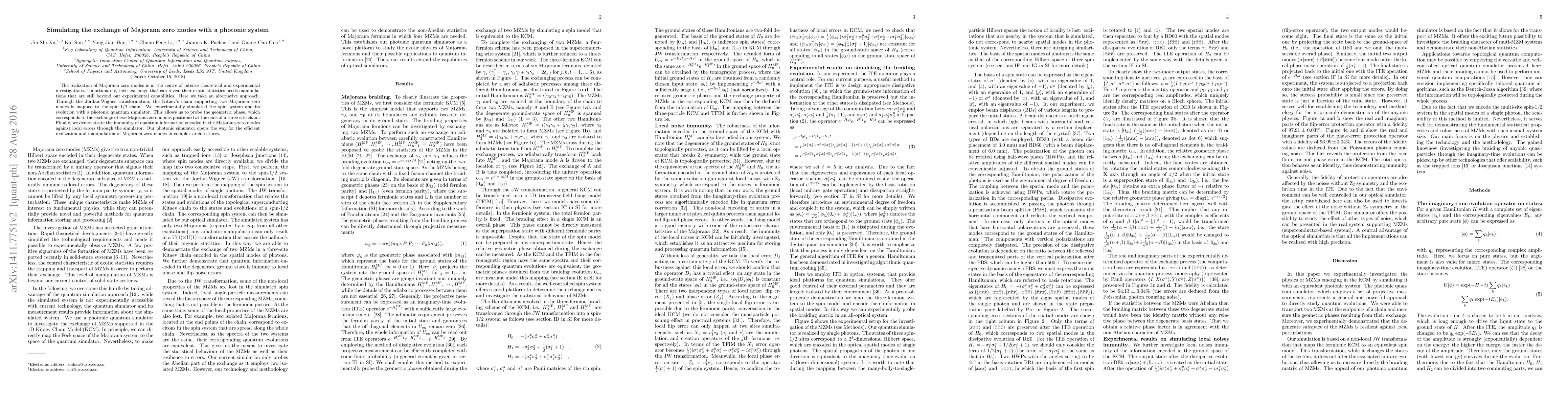 This research simulates the exchange of Majorana zero modes using a photonic quantum simulator based on Kitaev's chain, demonstrating geometric phase probing and the immunity of quantum information encoded in Majorana modes against local errors. The study suggests a novel approach to realize and manipulate Majorana zero modes in complex architectures.
