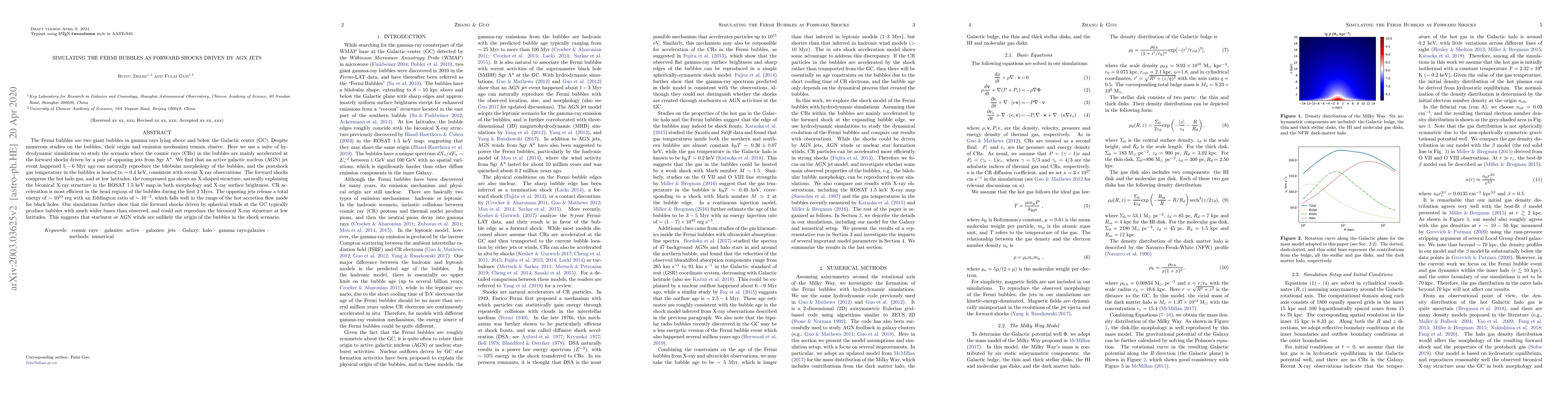 This paper uses hydrodynamic simulations to propose that the Fermi bubbles' origin lies in forward shocks driven by AGN jets from Sgr A*. The study finds that a jet event 5-6 Myr ago can reproduce the bubbles' morphology and temperature, suggesting efficient cosmic ray acceleration in the head regions.