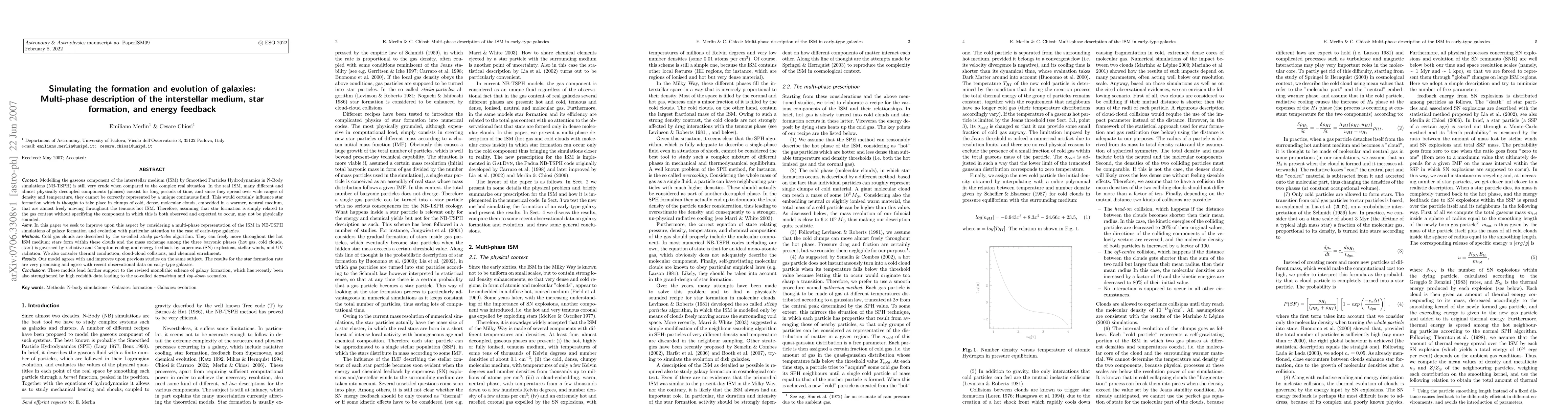 We present a multi-phase representation of the ISM in NB-TSPH simulations of galaxy formation and evolution with particular attention to the case of early-type galaxies. Cold gas clouds are described by the so-called sticky particles algorithm. They can freely move throughout the hot ISM medium; stars form within these clouds and the mass exchange among the three baryonic phases (hot gas, cold clouds, stars) is governed by radiative and Compton cooling and energy feedback by supernova (SN) explosions, stellar winds, and UV radiation. We also consider thermal conduction, cloud-cloud collisions, and chemical enrichment. Our model agrees with and improves upon previous studies on the same subject. The results for the star formation rate are very promising and agree with recent observational data on early-type galaxies. These models lend further support to the revised monolithic scheme of galaxy formation, which has recently been also strengthened by high redshift data leading to the so-called downsizing and top-down scenarios.