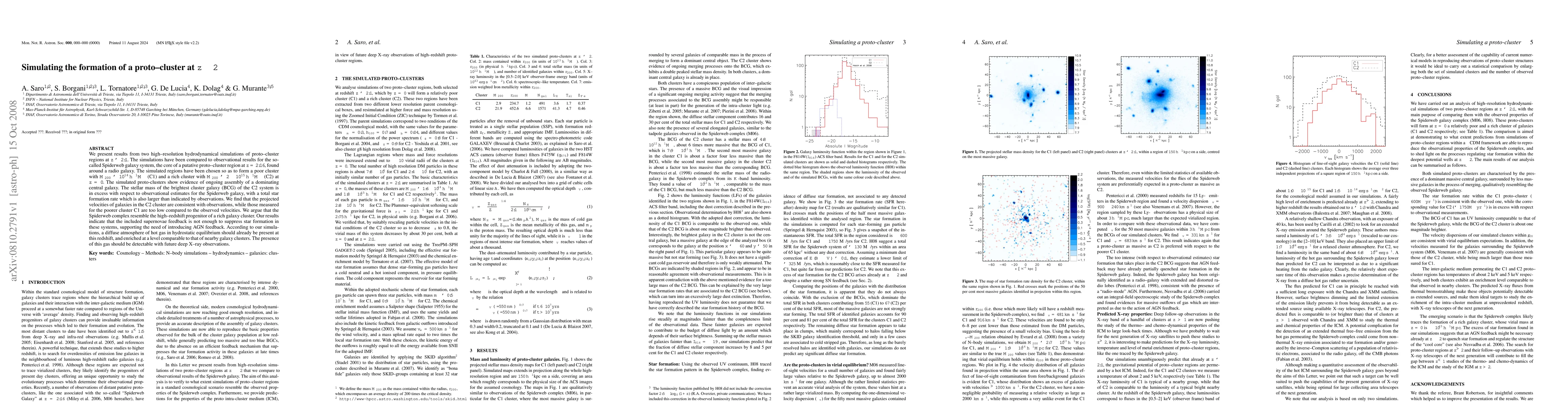 This paper presents high-resolution simulations of proto-clusters at z~2, comparing them to the Spiderweb galaxy system. The simulations suggest that the Spiderweb resembles the high-redshift progenitor of a rich cluster, though supernovae feedback alone is insufficient to match observed star formation rates, indicating the need for AGN feedback.