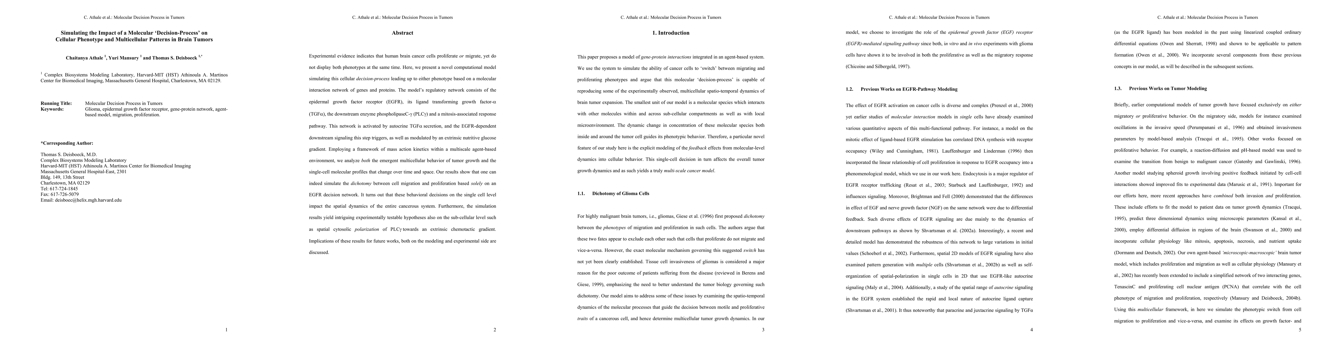 Experimental evidence indicates that human brain cancer cells proliferate or migrate, yet do not display both phenotypes at the same time. Here, we present a novel computational model simulating this cellular decision-process leading up to either phenotype based on a molecular interaction network of genes and proteins. The model's regulatory network consists of the epidermal growth factor receptor (EGFR), its ligand transforming growth factor-a (TGFa), the downstream enzyme phospholipaseC-gamma (PLCg) and a mitosis-associated response pathway. This network is activated by autocrine TGFa secretion, and the EGFR-dependent downstream signaling this step triggers, as well as modulated by an extrinsic nutritive glucose gradient. Employing a framework of mass action kinetics within a multiscale agent-based environment, we analyze both the emergent multicellular behavior of tumor growth and the single-cell molecular profiles that change over time and space. Our results show that one can indeed simulate the dichotomy between cell migration and proliferation based solely on an EGFR decision network. It turns out that these behavioral decisions on the single cell level impact the spatial dynamics of the entire cancerous system. Furthermore, the simulation results yield intriguing experimentally testable hypotheses also on the sub-cellular level such as spatial cytosolic polarization of PLCg towards an extrinsic chemotactic gradient. Implications of these results for future works, both on the modeling and experimental side are discussed.