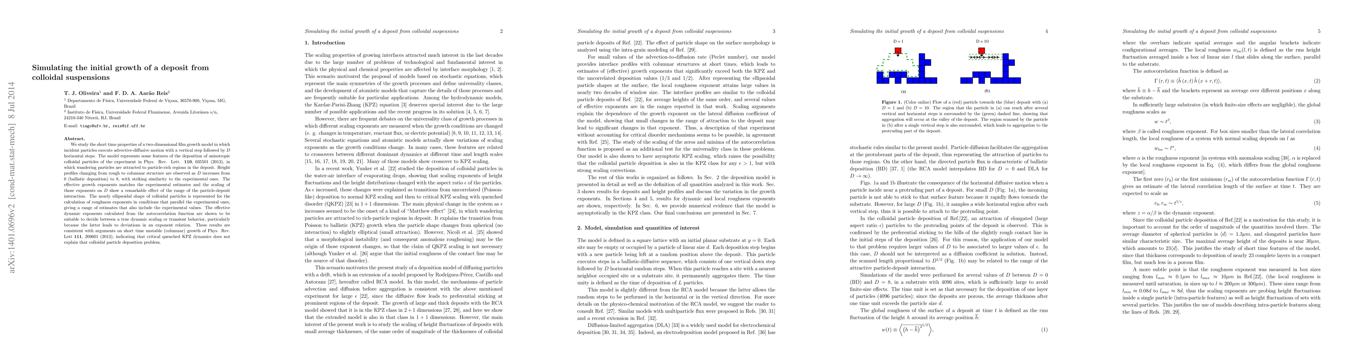We study the short time properties of a two-dimensional film growth model in which incident particles execute advective-diffusive motion with a vertical step followed by $D$ horizontal steps. The model represents some features of the deposition of anisotropic colloidal particles of the experiment in Phys. Rev. Lett. {\bf 110}, 035501 (2013), in which wandering particles are attracted to particle-rich regions in the deposit. Height profiles changing from rough to columnar structure are observed as $D$ increases from $0$ (ballistic deposition) to $8$, with striking similarity to the experimental ones. The effective growth exponents matches the experimental estimates and the scaling of those exponents on $D$ show a remarkable effect of the range of the particle-deposit interaction. The nearly ellipsoidal shape of colloidal particles is represented for the calculation of roughness exponents in conditions that parallel the experimental ones, giving a range of estimates that also include the experimental values. The effective dynamic exponents calculated from the autocorrelation function are shown to be suitable to decide between a true dynamic scaling or transient behavior, particularly because the latter leads to deviations in an exponent relation. These results are consistent with arguments on short time unstable (columnar) growth of Phys. Rev. Lett {\bf 111}, 209601 (2013), indicating that critical quenched KPZ dynamics does not explain that colloidal particle deposition problem.