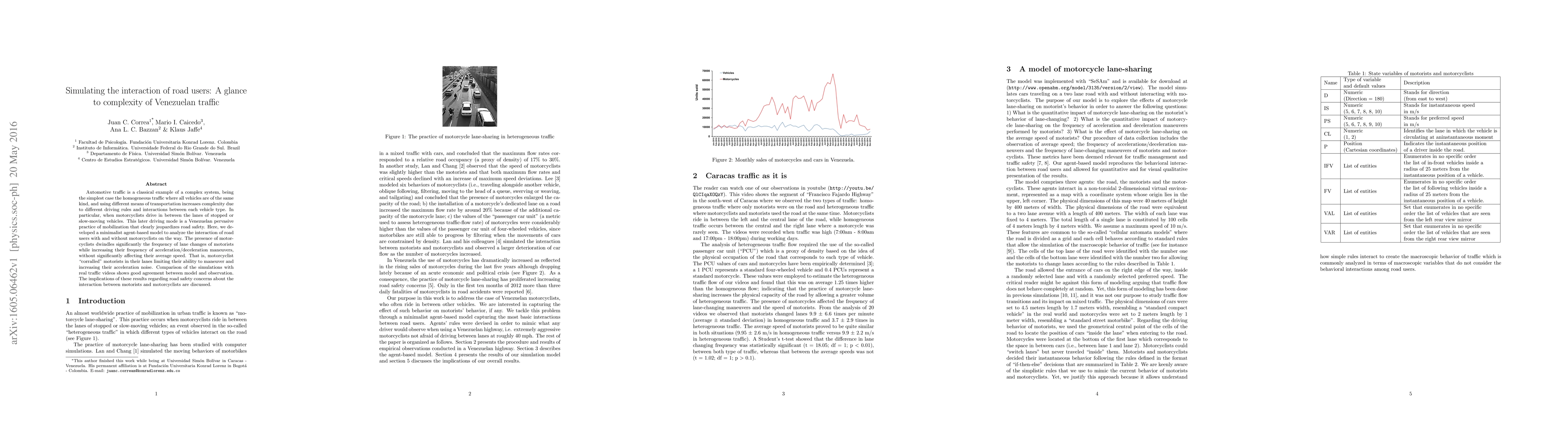 Automotive traffic is a classical example of a complex system, being the simplest case the homogeneous traffic where all vehicles are of the same kind, and using different means of transportation increases complexity due to different driving rules and interactions between each vehicle type. In particular, when motorcyclists drive in between the lanes of stopped or slow-moving vehicles. This later driving mode is a Venezuelan pervasive practice of mobilization that clearly jeopardizes road safety. We developed a minimalist agent-based model to analyze the interaction of road users with and without motorcyclists on the way. The presence of motorcyclists dwindles significantly the frequency of lane changes of motorists while increasing their frequency of acceleration-deceleration maneuvers, without significantly affecting their average speed. That is, motorcyclist "corralled" motorists in their lanes limiting their ability to maneuver and increasing their acceleration noise. Comparison of the simulations with real traffic videos shows good agreement between model and observation. The implications of these results regarding road safety concerns about the interaction between motorists and motorcyclists are discussed.
