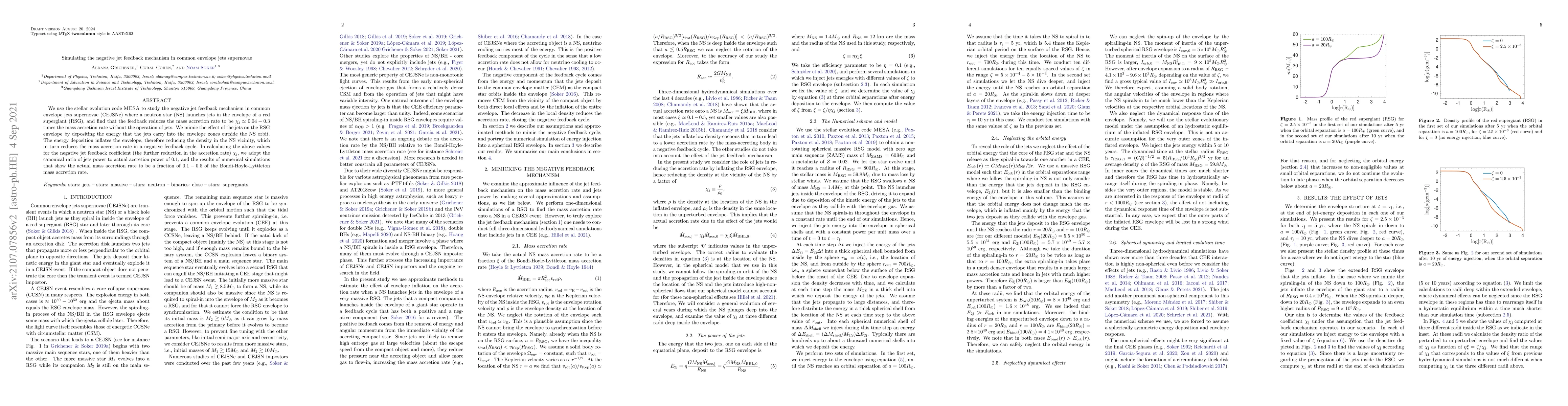 We use the stellar evolution code MESA to study the negative jet feedback mechanism in common envelope jets supernovae (CEJSNe) where a neutron star (NS) launches jets in the envelope of a red supergiant (RSG), and find that the feedback reduces the mass accretion rate to be $\chi_{\rm j} \simeq 0.04-0.3$ times the mass accretion rate without the operation of jets. We mimic the effect of the jets on the RSG envelope by depositing the energy that the jets carry into the envelope zones outside the NS orbit. The energy deposition inflates the envelope, therefore reducing the density in the NS vicinity, which in turn reduces the mass accretion rate in a negative feedback cycle. In calculating the above values for the negative jet feedback coefficient (the further reduction in the accretion rate) $\chi_{\rm j}$, we adopt the canonical ratio of jets power to actual accretion power of $0.1$, and the results of numerical simulations that show the actual mass accretion rate to be a fraction of $0.1-0.5$ of the Bondi-Hoyle-Lyttleton mass accretion rate.