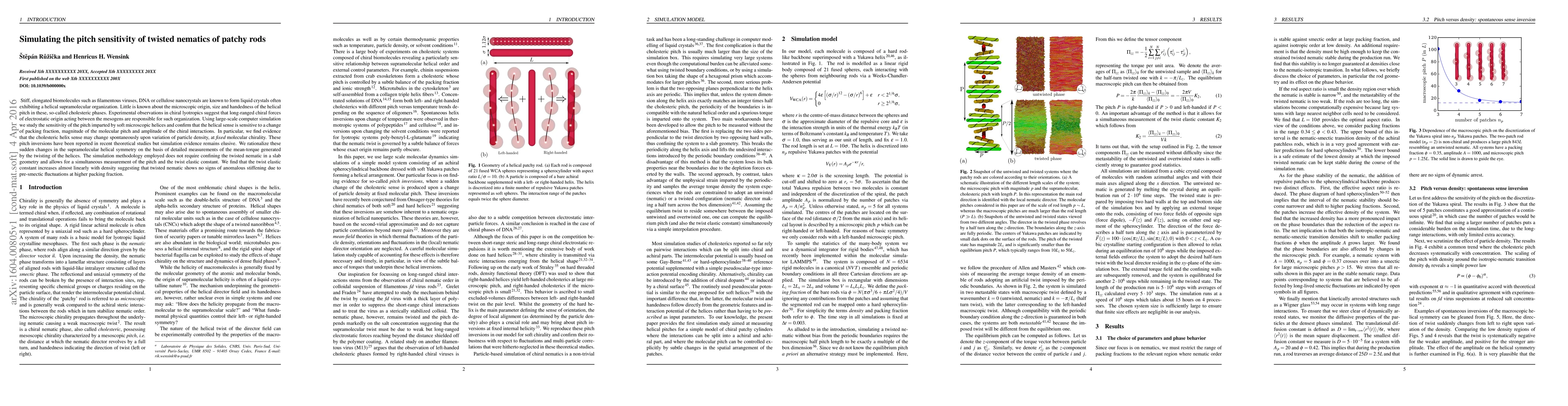 Stiff, elongated biomolecules such as filamentous viruses, DNA or cellulose nanocrystals are known to form liquid crystals often exhibiting a helical supramolecular organization. Little is known about the microscopic origin, size and handedness of the helical pitch in these, so-called cholesteric phases. Experimental observations in chiral lyotropics suggest that long-ranged chiral forces of electrostatic origin acting between the mesogens are responsible for such organization. Using large-scale computer simulation we study the sensitivity of the pitch imparted by soft microscopic helices and confirm that the helical sense is sensitive to a change of packing fraction, magnitude of the molecular pitch and amplitude of the chiral interactions. In particular, we find evidence that the cholesteric helix sense may change spontaneously upon variation of particle density, at fixed molecular chirality. These pitch inversions have been reported in recent theoretical studies but simulation evidence remains elusive. We rationalize these sudden changes in the supramolecular helical symmetry on the basis of detailed measurements of the mean-torque generated by the twisting of the helices. The simulation methodology employed does not require confining the twisted nematic in a slab geometry and allows for a simultaneous measurement of the pitch and the twist elastic constant. We find that the twist elastic constant increases almost linearly with density suggesting that twisted nematic shows no signs of anomalous stiffening due to pre-smectic fluctuations at higher packing fraction.