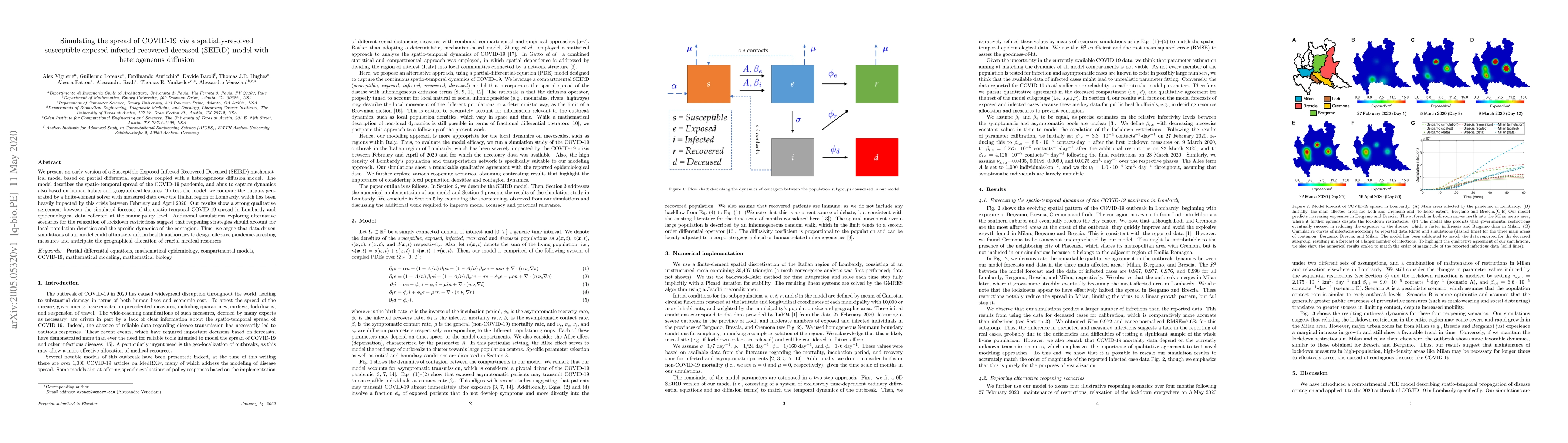 This paper introduces a SEIRD model with heterogeneous diffusion to simulate the spatial spread of COVID-19 in Lombardy, Italy, showing strong agreement with local epidemiological data. The model suggests that reopening strategies should consider local population densities and contagion dynamics to inform effective pandemic control and resource allocation.