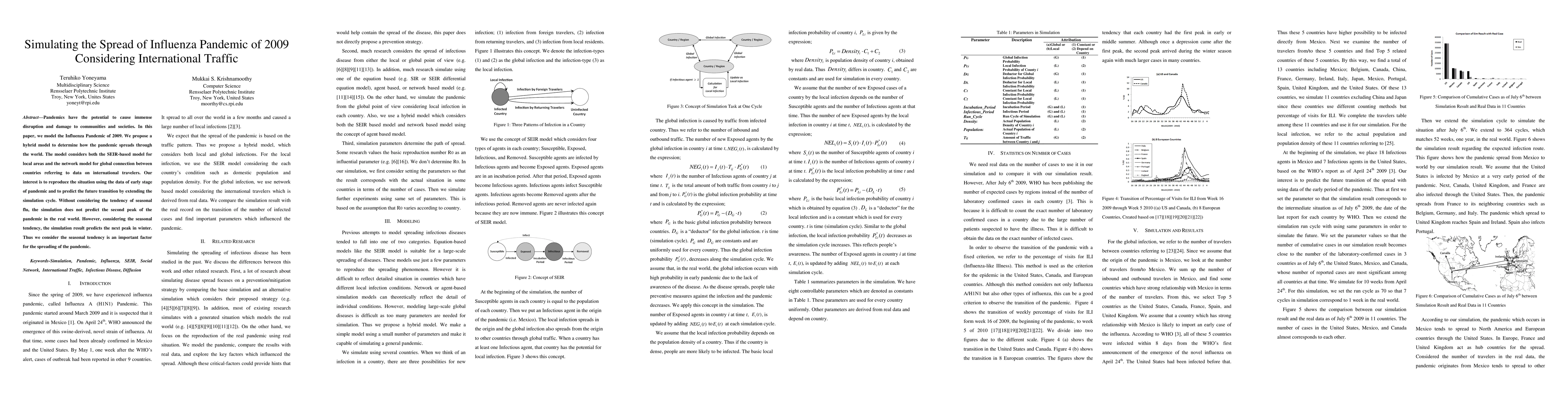 Pandemics have the potential to cause immense disruption and damage to communities and societies. In this paper, we model the Influenza Pandemic of 2009. We propose a hybrid model to determine how the pandemic spreads through the world. The model considers both the SEIR-based model for local areas and the network model for global connection between countries referring to data on international travelers. Our interest is to reproduce the situation using the data of early stage of pandemic and to predict the future transition by extending the simulation cycle. Without considering the tendency of seasonal flu, the simulation does not predict the second peak of the pandemic in the real world. However, considering the seasonal tendency, the simulation result predicts the next peak in winter. Thus we consider the seasonal tendency is an important factor for the spreading of the pandemic.