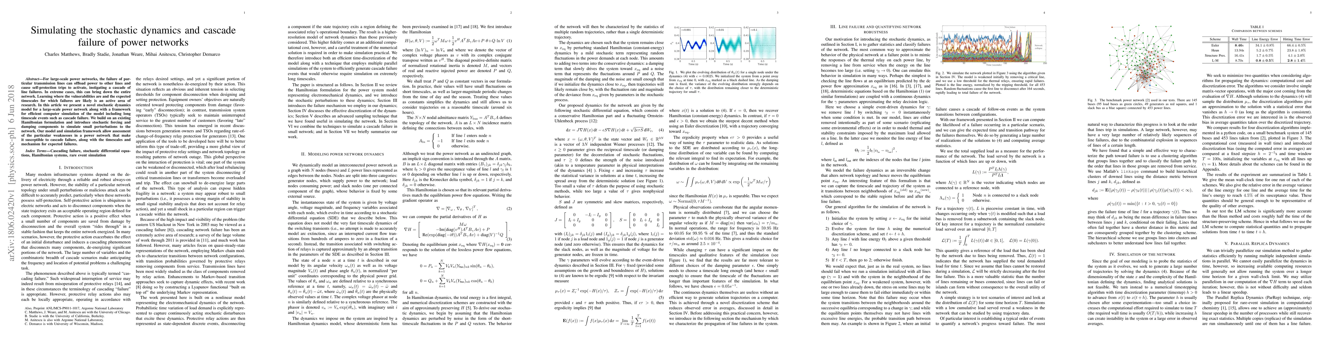 For large-scale power networks, the failure of particular transmission lines can offload power to other lines and cause self-protection trips to activate, instigating a cascade of line failures. In extreme cases, this can bring down the entire network. Learning where the vulnerabilities are and the expected timescales for which failures are likely is an active area of research. In this article we present a novel stochastic dynamics model for a large-scale power network along with a framework for efficient computer simulation of the model including long timescale events such as cascade failure. We build on an existing Hamiltonian formulation and introduce stochastic forcing and damping components to simulate small perturbations to the network. Our model and simulation framework allow assessment of the particular weaknesses in a power network that make it susceptible to cascade failure, along with the timescales and mechanism for expected failures.
