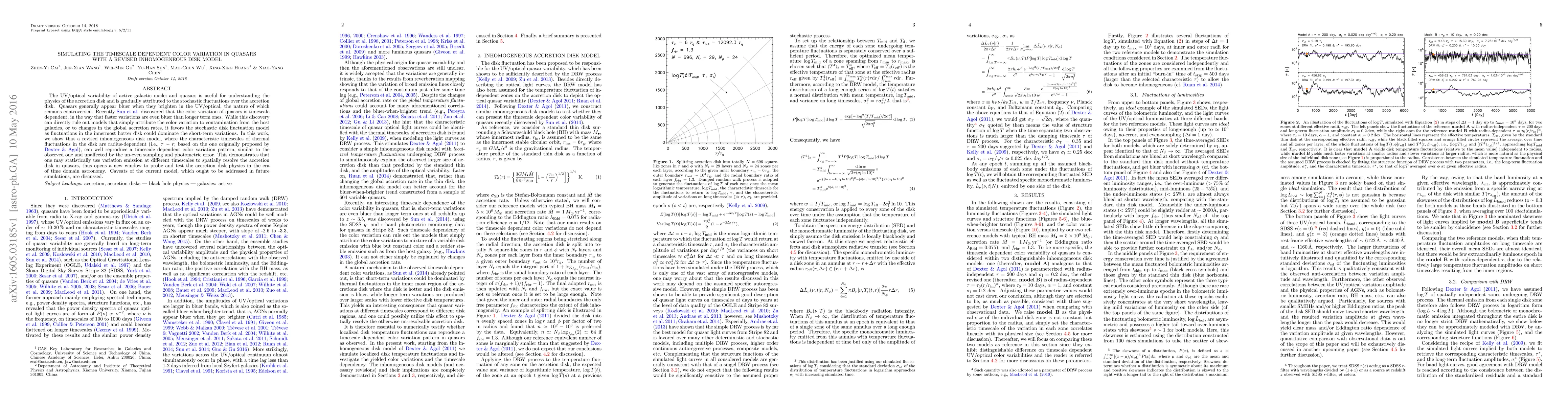 The UV/optical variability of active galactic nuclei and quasars is useful for understanding the physics of the accretion disk and is gradually attributed to the stochastic fluctuations over the accretion disk. Quasars generally appear bluer when they brighten in the UV/optical, the nature of which remains controversial. Recently \citeauthor{Sun2014} discovered that the color variation of quasars is timescale dependent, in the way that faster variations are even bluer than longer term ones. While this discovery can directly rule out models that simply attribute the color variation to contamination from the host galaxies, or to changes in the global accretion rates, it favors the stochastic disk fluctuation model as fluctuations in the innermost hotter disk could dominate the short-term variations. In this work, we show that a revised inhomogeneous disk model, where the characteristic timescales of thermal fluctuations in the disk are radius-dependent (i.e., $\tau \sim r$; based on the one originally proposed by \citeauthor{DexterAgol2011}), can well reproduce a timescale dependent color variation pattern, similar to the observed one and unaffected by the un-even sampling and photometric error. This demonstrates that one may statistically use variation emission at different timescales to spatially resolve the accretion disk in quasars, thus opens a new window to probe and test the accretion disk physics in the era of time domain astronomy. Caveats of the current model, which ought to be addressed in future simulations, are discussed.