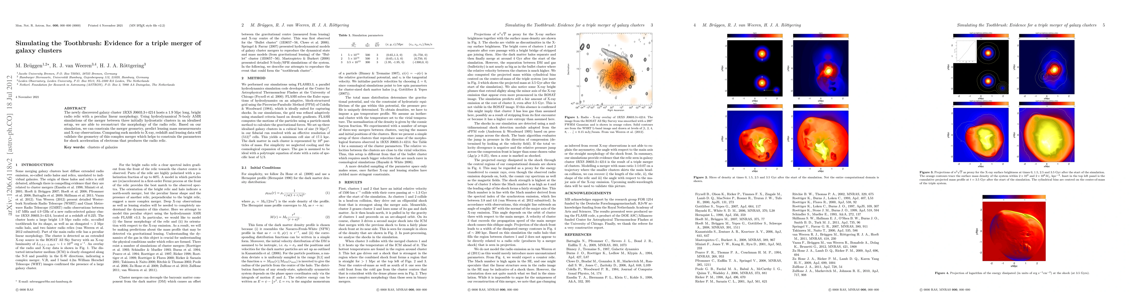 Researchers used simulations to study a complex galaxy cluster merger, recreating the morphology of a bright radio relic and constraining the merger geometry. Their findings aim to validate the shock acceleration mechanism that produces the relic.