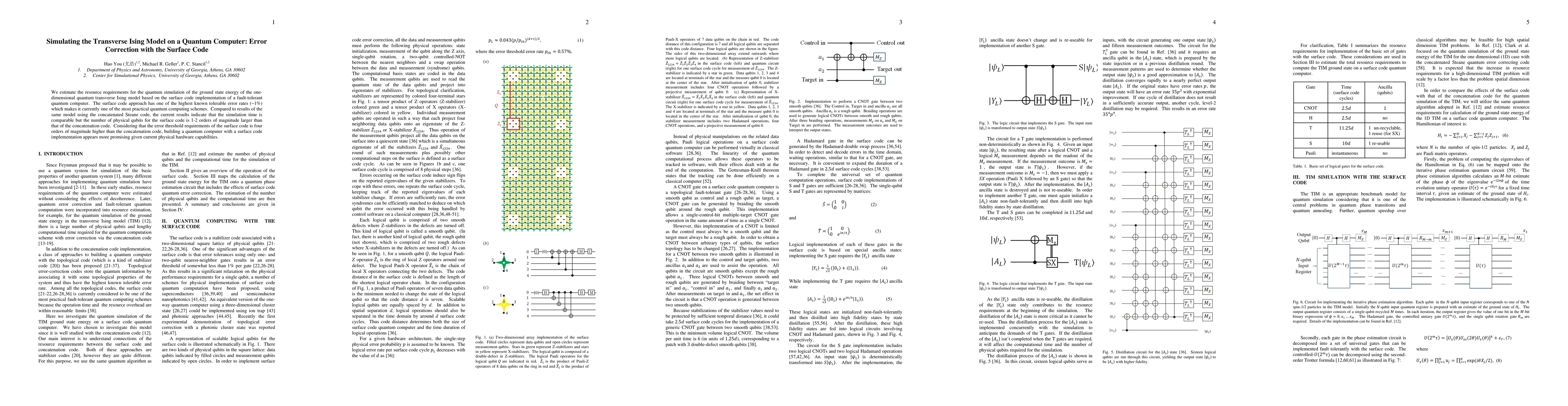 This paper estimates the resource needs for simulating the one-dimensional quantum transverse Ising model using the surface code, finding comparable simulation times but significantly more physical qubits compared to the concatenated Steane code. Despite higher error threshold requirements, the surface code's practical error tolerance makes it more promising for current quantum hardware.