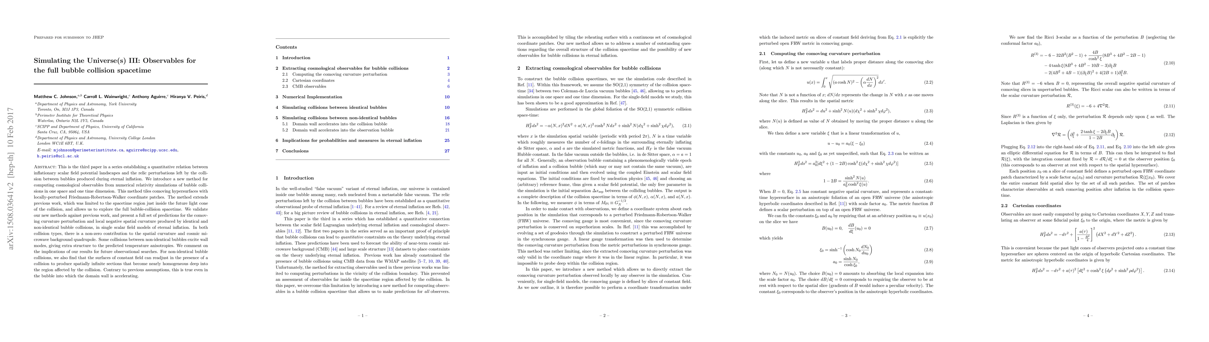 This is the third paper in a series establishing a quantitative relation between inflationary scalar field potential landscapes and the relic perturbations left by the collision between bubbles produced during eternal inflation. We introduce a new method for computing cosmological observables from numerical relativity simulations of bubble collisions in one space and one time dimension. This method tiles comoving hypersurfaces with locally-perturbed Friedmann-Robertson-Walker coordinate patches. The method extends previous work, which was limited to the spacetime region just inside the future light cone of the collision, and allows us to explore the full bubble-collision spacetime. We validate our new methods against previous work, and present a full set of predictions for the comoving curvature perturbation and local negative spatial curvature produced by identical and non-identical bubble collisions, in single scalar field models of eternal inflation. In both collision types, there is a non-zero contribution to the spatial curvature and cosmic microwave background quadrupole. Some collisions between non-identical bubbles excite wall modes, giving extra structure to the predicted temperature anisotropies. We comment on the implications of our results for future observational searches. For non-identical bubble collisions, we also find that the surfaces of constant field can readjust in the presence of a collision to produce spatially infinite sections that become nearly homogeneous deep into the region affected by the collision. Contrary to previous assumptions, this is true even in the bubble into which the domain wall is accelerating.