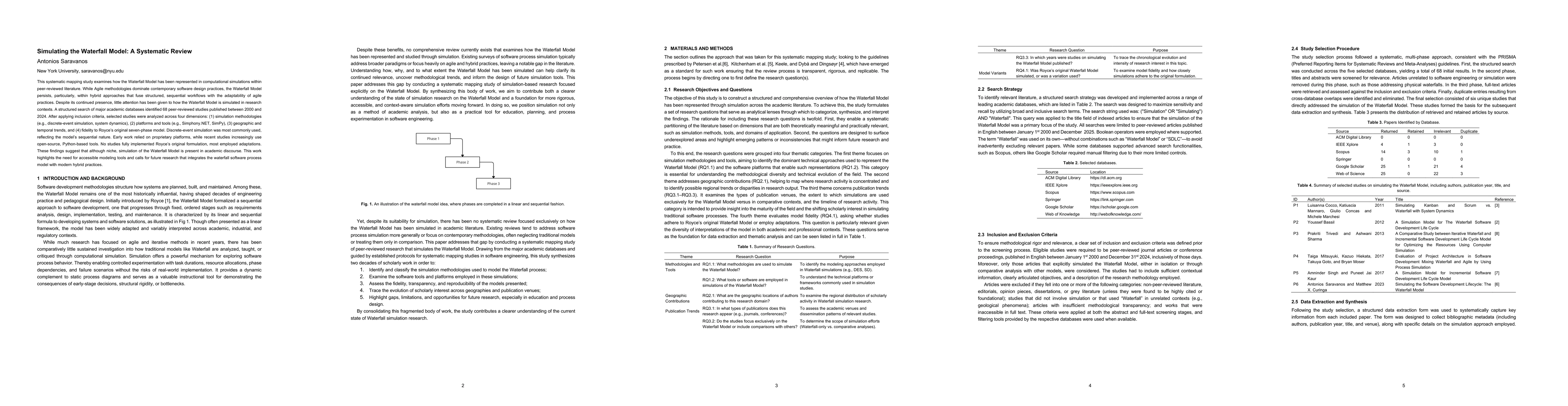 This systematic mapping study examines how the Waterfall Model has been represented in computational simulations within peer-reviewed literature. While Agile methodologies dominate contemporary software design practices, the Waterfall Model persists, particularly, within hybrid approaches that fuse structured, sequential workflows with the adaptability of agile practices. Despite its continued presence, little attention has been given to how the Waterfall Model is simulated in research contexts. A structured search of major academic databases identified 68 peer-reviewed studies published between 2000 and 2024. After applying inclusion criteria, selected studies were analyzed across four dimensions: (1) simulation methodologies (e.g., discrete-event simulation, system dynamics), (2) platforms and tools (e.g., Simphony.NET, SimPy), (3) geographic and temporal trends, and (4) fidelity to Royce's original seven-phase model. Discrete-event simulation was most commonly used, reflecting the model's sequential nature. Early work relied on proprietary platforms, while recent studies increasingly use open-source, Python-based tools. No studies fully implemented Royce's original formulation, most employed adaptations. These findings suggest that although niche, simulation of the Waterfall Model is present in academic discourse. This work highlights the need for accessible modeling tools and calls for future research that integrates the waterfall software process model with modern hybrid practices.