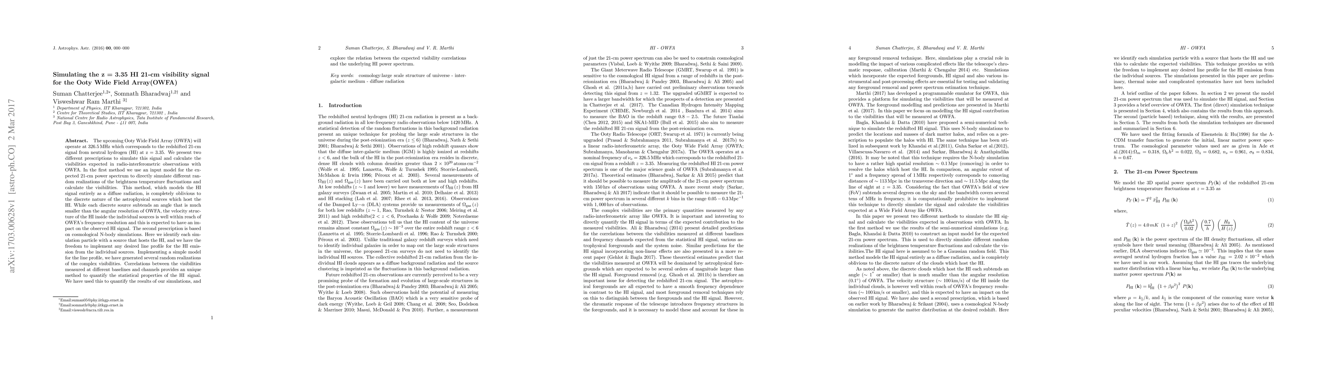 Researchers developed two methods to simulate the 21-cm signal from neutral hydrogen at z = 3.35 for the Ooty Wide Field Array, exploring its statistical properties through radio-interferometric observations.