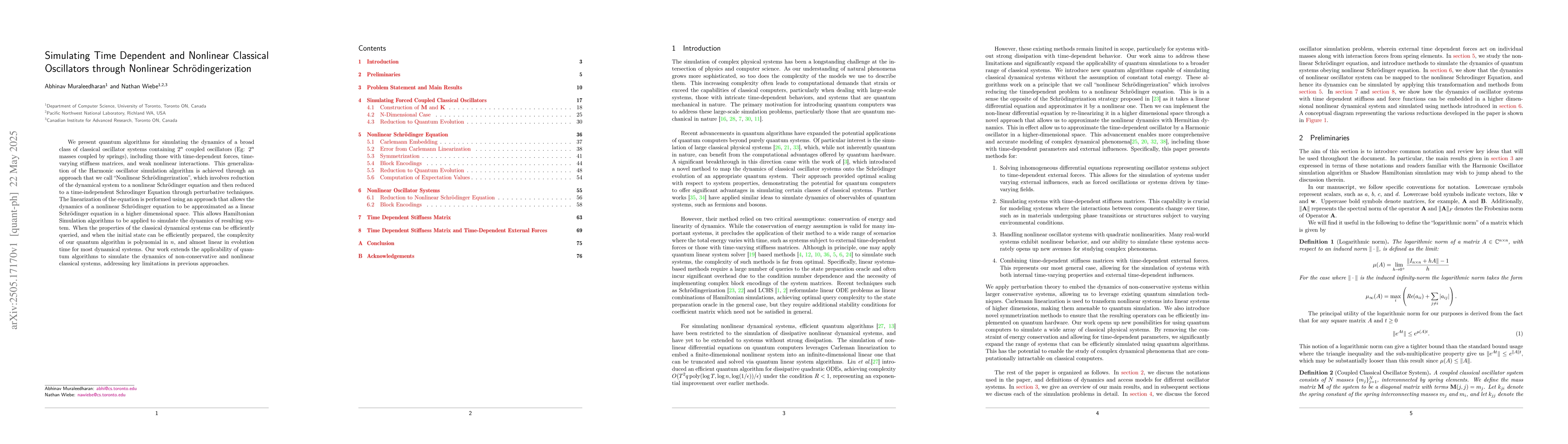 The research introduces quantum algorithms for simulating classical oscillator systems, including time-dependent forces, time-varying stiffness matrices, and weak nonlinear interactions. This is achieved via 'Nonlinear Schrödingerization', reducing the dynamical system to a nonlinear Schrödinger equation, then to a time-independent Schrodinger equation using perturbative techniques.