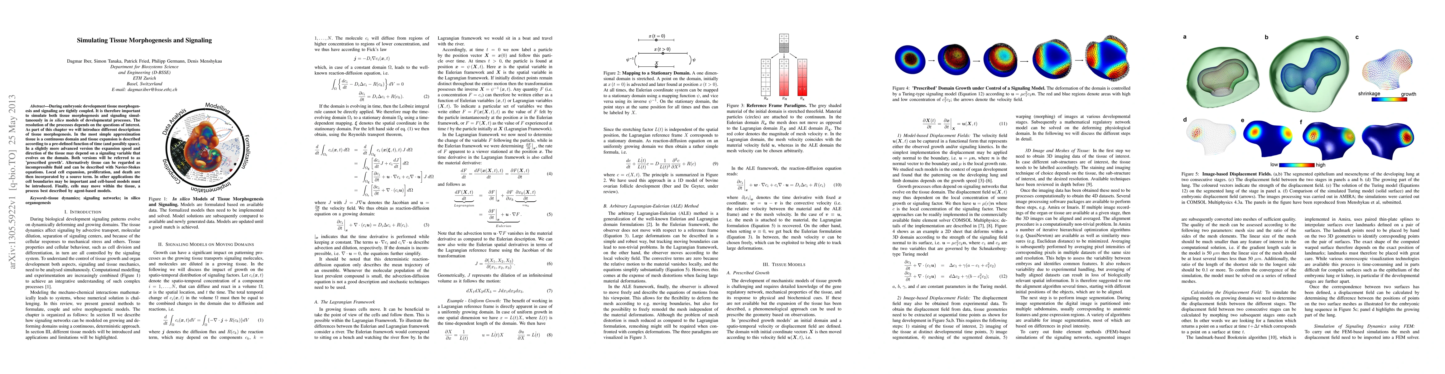 This paper discusses the simulation of tissue morphogenesis and signaling during embryonic development, emphasizing the importance of integrating both processes in in silico models. It explores various modeling approaches, from simple prescribed growth models to more complex agent-based models that incorporate cell dynamics and fluid mechanics.
