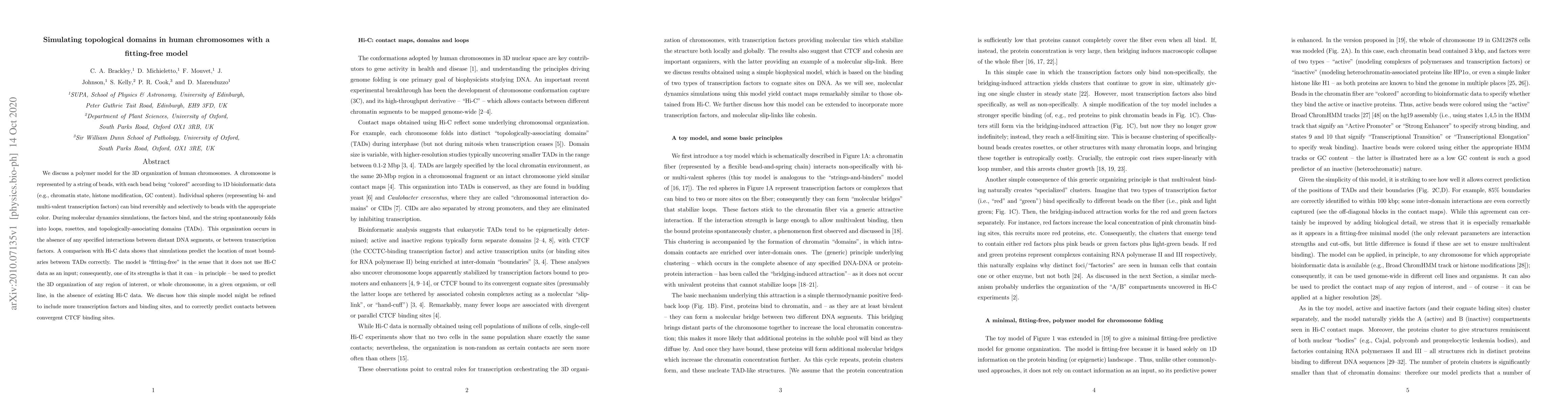 We discuss a polymer model for the 3D organization of human chromosomes. A chromosome is represented by a string of beads, with each bead being "colored" according to 1D bioinformatic data (e.g., chromatin state, histone modification, GC content). Individual spheres (representing bi- and multi-valent transcription factors) can bind reversibly and selectively to beads with the appropriate color. During molecular dynamics simulations, the factors bind, and the string spontaneously folds into loops, rosettes, and topologically-associating domains (TADs). This organization occurs in the absence of any specified interactions between distant DNA segments, or between transcription factors. A comparison with Hi-C data shows that simulations predict the location of most boundaries between TADs correctly. The model is "fitting-free" in the sense that it does not use Hi-C data as an input; consequently, one of its strengths is that it can -- in principle -- be used to predict the 3D organization of any region of interest, or whole chromosome, in a given organism, or cell line, in the absence of existing Hi-C data. We discuss how this simple model might be refined to include more transcription factors and binding sites, and to correctly predict contacts between convergent CTCF binding sites.