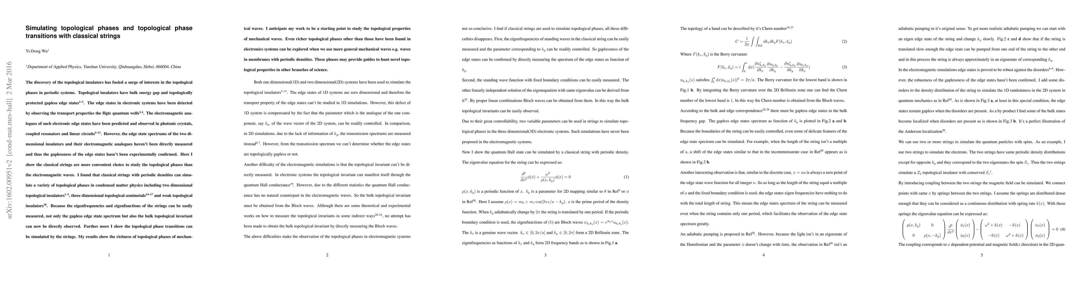 The discovery of the topological insulators has fueled a surge of interests in the topological phases in periodic systems. Topological insulators have bulk energy gap and topologically protected gapless edge states. The edge states in electronic systems have been detected by observing the transport properties the Hgte quantum wells. The electromagnetic analogues of such electronic edge states have been predicted and observed in photonic crystals, coupled resonators and linear circuits. However, the edge state spectrums of the two dimensional insulators and their electromagnetic analogues haven't been directly measured and thus the gaplessness of the edge states hasn't been experimentally confirmed. Here I show the classical strings are more convenient choice to study the topological phases than the electromagnetic waves. I found that classical strings with periodic densities can simulate a variety of topological phases in condensed matter physics including two dimensional topological insulators, three dimensional topological semimetals and weak topological insulators. Because the eigenfrequencies and eigenfunctions of the strings can be easily measured, not only the gapless edge state spectrum but also the bulk topological invariant can now be directly observed. Further more I show the topological phase transitions can be simulated by the strings. My results show the richness of topological phases of mechanical waves. I anticipate my work to be a starting point to study the topological properties of mechanical waves. Even richer topological phases other than those have been found in electronics systems can be explored when we use more general mechanical waves e.g. waves in membranes with periodic densities. These phases may provide guides to hunt novel topological properties in other branches of science.