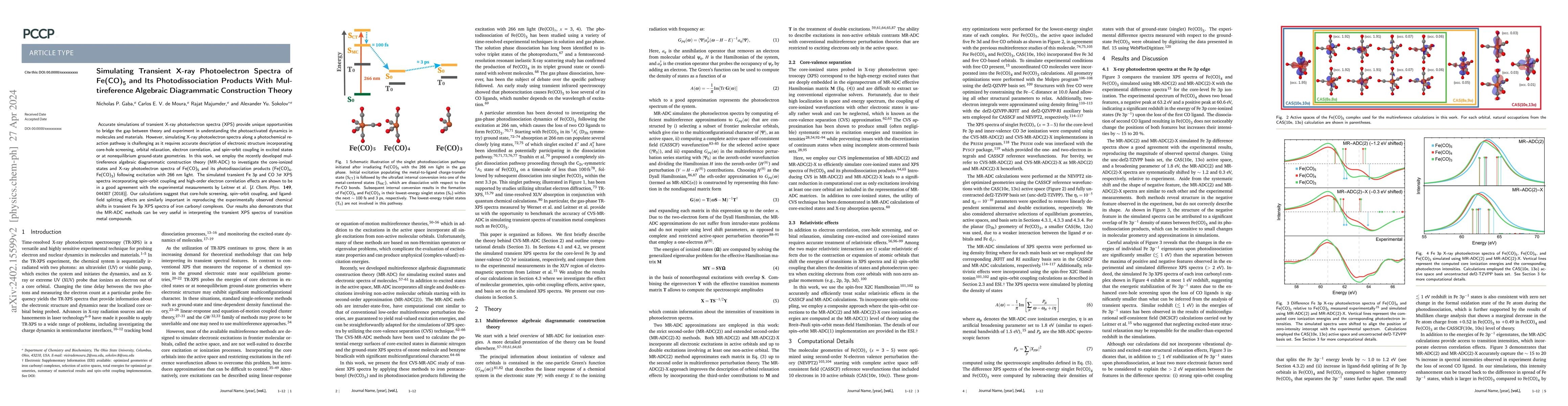 This research uses multireference algebraic diagrammatic construction theory (MR-ADC) to simulate transient X-ray photoelectron spectra (XPS) of Fe(CO)5 and its photodissociation products (Fe(CO)4, Fe(CO)3), showing good agreement with experimental data. The study highlights the importance of core-hole screening, spin-orbit coupling, and electron correlation in accurately reproducing observed chemical shifts.