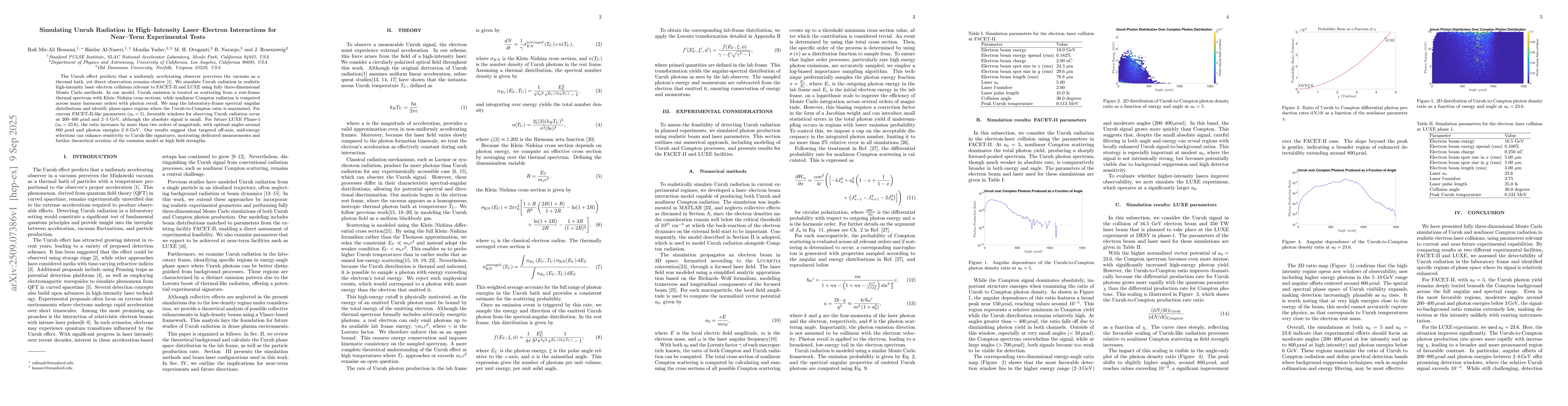 The Unruh effect predicts that a uniformly accelerating observer perceives the vacuum as a thermal bath, yet direct observation remains elusive [1]. We simulate Unruh radiation in realistic high-intensity laser-electron collisions relevant to FACET-II and LUXE using fully three-dimensional Monte Carlo methods. In our model, Unruh emission is treated as scattering from a rest-frame thermal spectrum with Klein-Nishina cross sections, while nonlinear Compton radiation is computed across many harmonic orders with photon recoil. We map the laboratory-frame spectral-angular distributions and identify phase-space regions where the Unruh-to-Compton ratio is maximized. For current FACET-II-like parameters (a0 = 5), favorable windows for observing Unruh radiation occur at 200-400 microrad and 2-3 GeV, although the absolute signal is small. For future LUXE Phase-1 (a0 = 23.6), the ratio increases by more than two orders of magnitude, with optimal angles around 800 microrad and photon energies 2-6 GeV. Our results suggest that targeted off-axis, mid-energy selections can enhance sensitivity to Unruh-like signatures, motivating dedicated measurements and further theoretical scrutiny of the emission model at high field strengths.