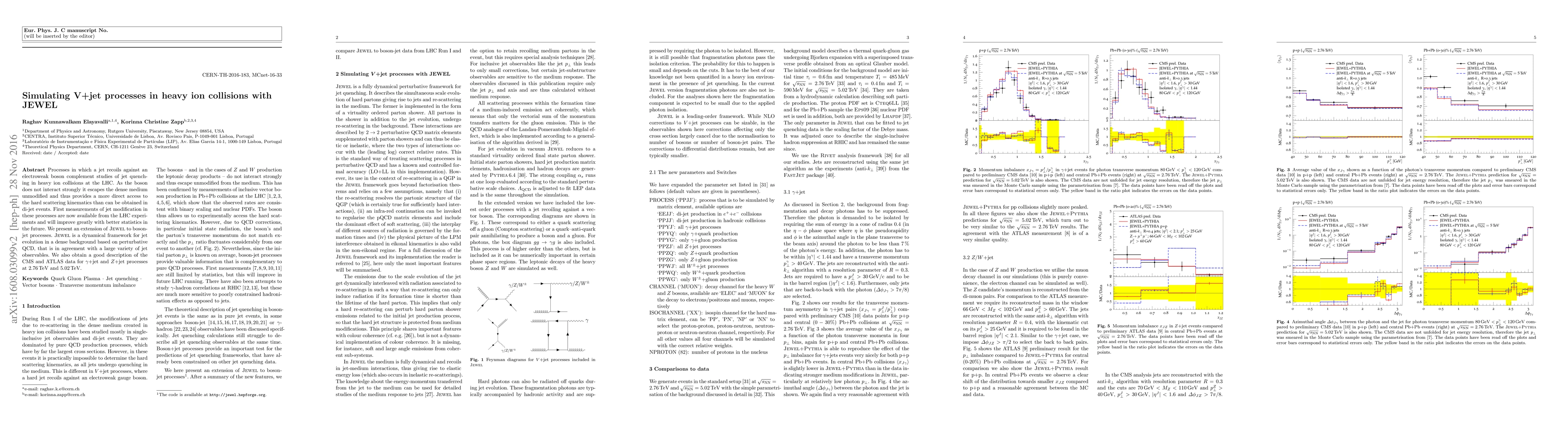 This paper extends the JEWEL framework to simulate V+jet processes in heavy ion collisions, providing insights into jet quenching and hard scattering kinematics. The model successfully describes CMS and ATLAS data for y+jet and Z+jet events at various collision energies.