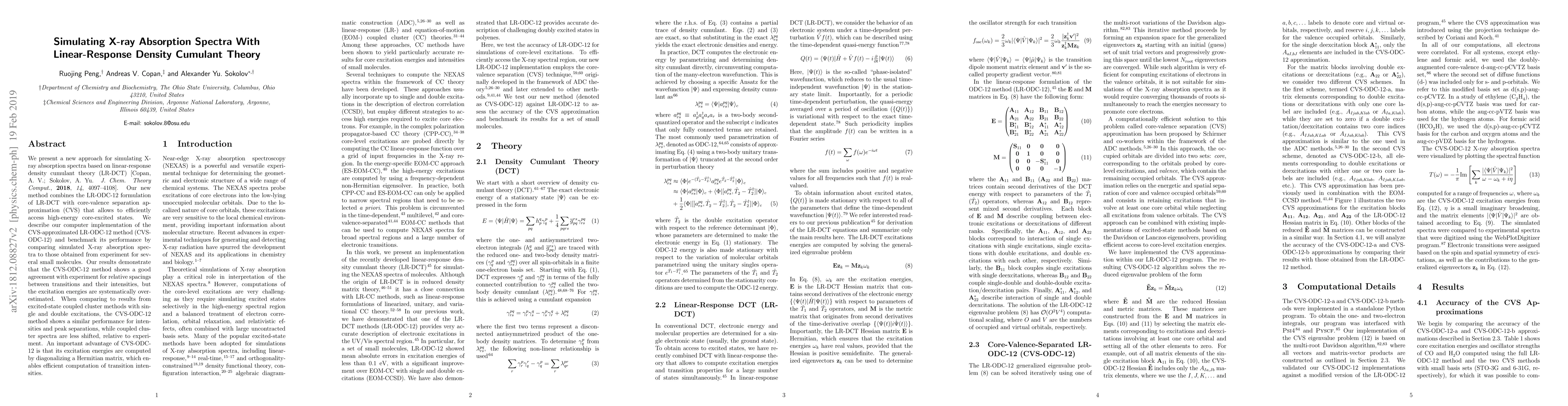 This paper introduces a new method for simulating X-ray absorption spectra using linear-response density cumulant theory (LR-DCT) combined with core-valence separation approximation (CVS). The CVS-ODC-12 method shows good agreement with experimental data for transition intensities and spacings, though it systematically overestimates excitation energies.