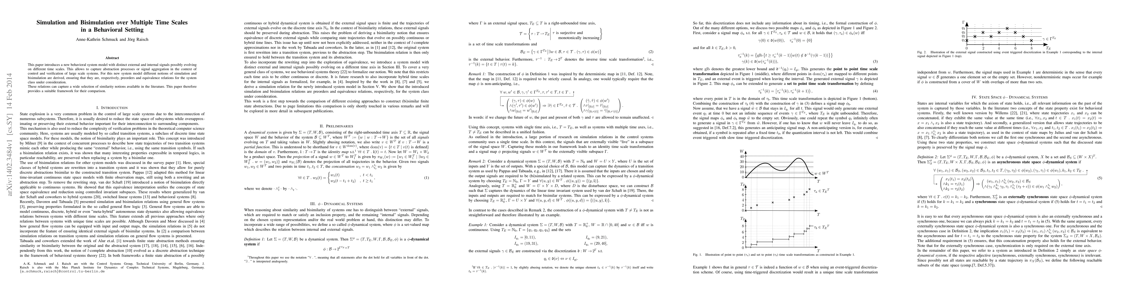 This paper introduces a new behavioral system model with distinct external and internal signals possibly evolving on different time scales. This allows to capture abstraction processes or signal aggregation in the context of control and verification of large scale systems. For this new system model different notions of simulation and bisimulation are derived, ensuring that they are, respectively, preorders and equivalence relations for the system class under consideration. These relations can capture a wide selection of similarity notions available in the literature. This paper therefore provides a suitable framework for their comparison