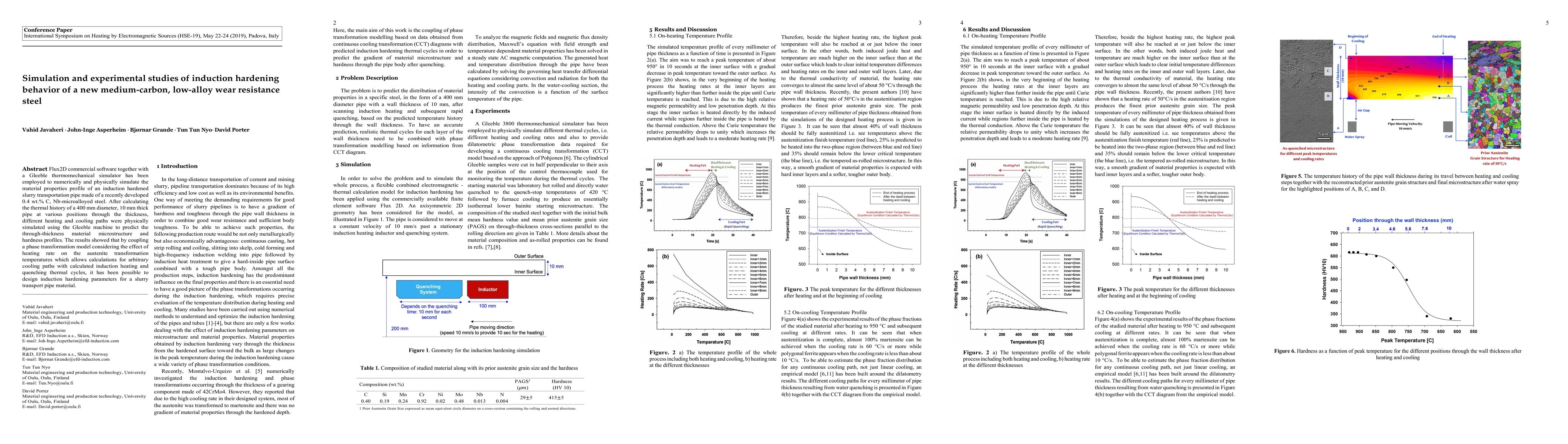 This study uses Flux2D software and a Gleeble simulator to numerically and experimentally analyze the induction hardening behavior of a new medium-carbon, low-alloy steel used in slurry transportation pipes. The research successfully predicts the material's microstructure and hardness profiles through calculated thermal cycles, enabling optimized induction hardening parameters.