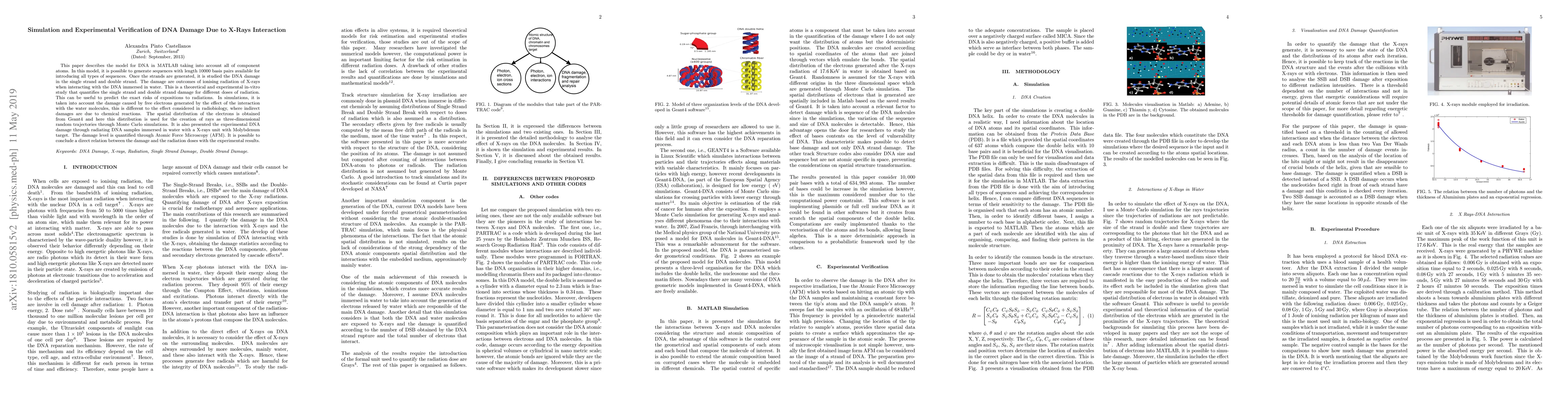 This paper models DNA in MATLAB to simulate DNA damage from X-rays, incorporating all component atoms and using Monte Carlo simulations for electron distribution. Experimental verification using AFM confirms a direct correlation between radiation dose and DNA damage levels.
