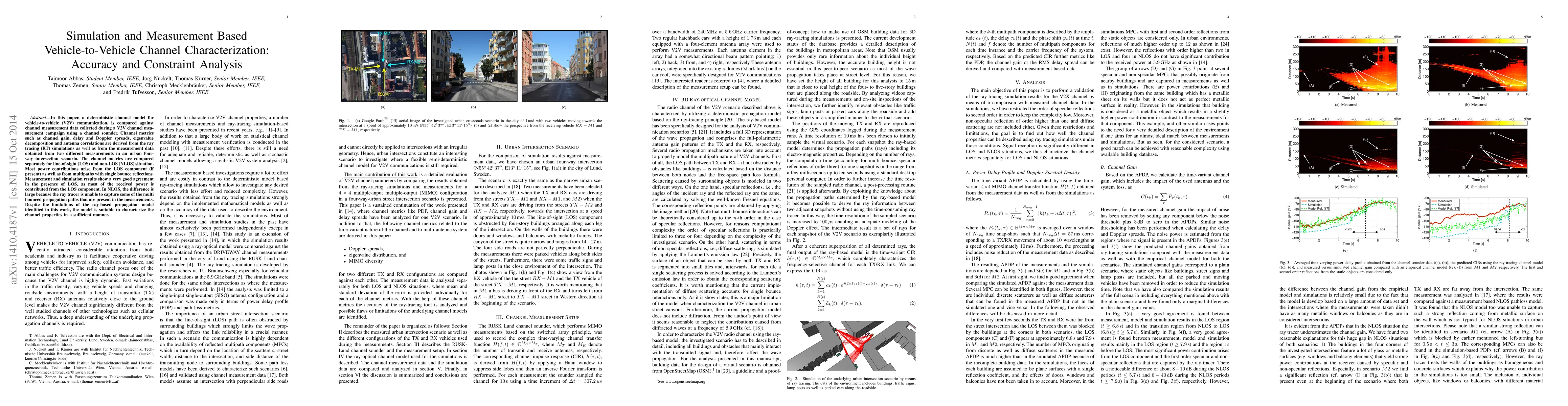 In this paper, a deterministic channel model for vehicle-to-vehicle (V2V) communication, is compared against channel measurement data collected during a V2V channel measurement campaign using a channel sounder. Channel metrics such as channel gain, delay and Doppler spreads, eigenvalue decomposition and antenna correlations are derived from the ray tracing (RT) simulations as well as from the measurement data obtained from two different measurements in an urban four-way intersection scenario. The channel metrics are compared separately for line-of-sight (LOS) and non-LOS (NLOS) situation. Most power contributions arise from the LOS component (if present) as well as from multipaths with single bounce reflections. Measurement and simulation results show a very good agreement in the presence of LOS, as most of the received power is contributed from the LOS component. In NLOS, the difference is large because the ray tracer is unable to capture some of the multi bounced propagation paths that are present in the measurements. Despite the limitations of the ray-based propagation model identified in this work, the model is suitable to characterize the channel properties in a sufficient manner.