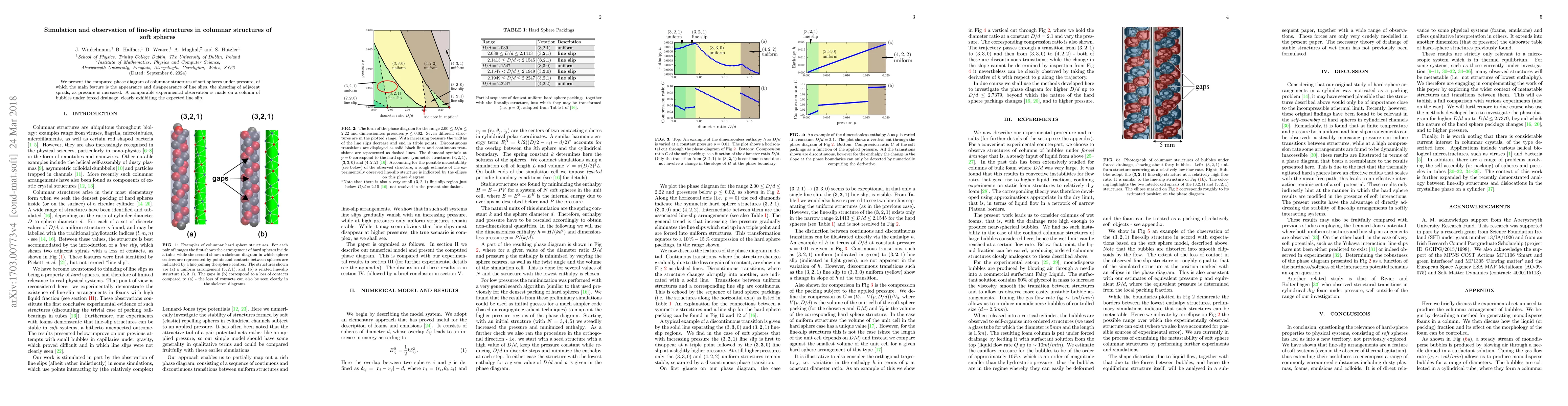 This study computes the phase diagram of columnar soft spheres under pressure, revealing the emergence and disappearance of line-slip structures. Experimental observations on bubble columns under forced drainage corroborate the predicted line-slip behavior.