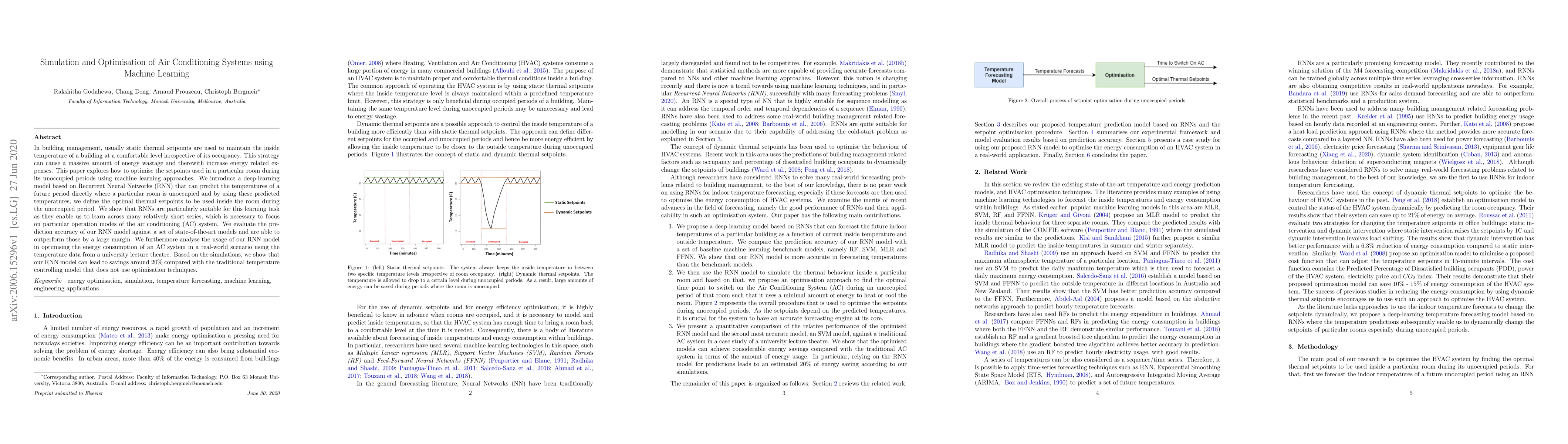 In building management, usually static thermal setpoints are used to maintain the inside temperature of a building at a comfortable level irrespective of its occupancy. This strategy can cause a massive amount of energy wastage and therewith increase energy related expenses. This paper explores how to optimise the setpoints used in a particular room during its unoccupied periods using machine learning approaches. We introduce a deep-learning model based on Recurrent Neural Networks (RNN) that can predict the temperatures of a future period directly where a particular room is unoccupied and by using these predicted temperatures, we define the optimal thermal setpoints to be used inside the room during the unoccupied period. We show that RNNs are particularly suitable for this learning task as they enable us to learn across many relatively short series, which is necessary to focus on particular operation modes of the air conditioning (AC) system. We evaluate the prediction accuracy of our RNN model against a set of state-of-the-art models and are able to outperform those by a large margin. We furthermore analyse the usage of our RNN model in optimising the energy consumption of an AC system in a real-world scenario using the temperature data from a university lecture theatre. Based on the simulations, we show that our RNN model can lead to savings around 20% compared with the traditional temperature controlling model that does not use optimisation techniques.