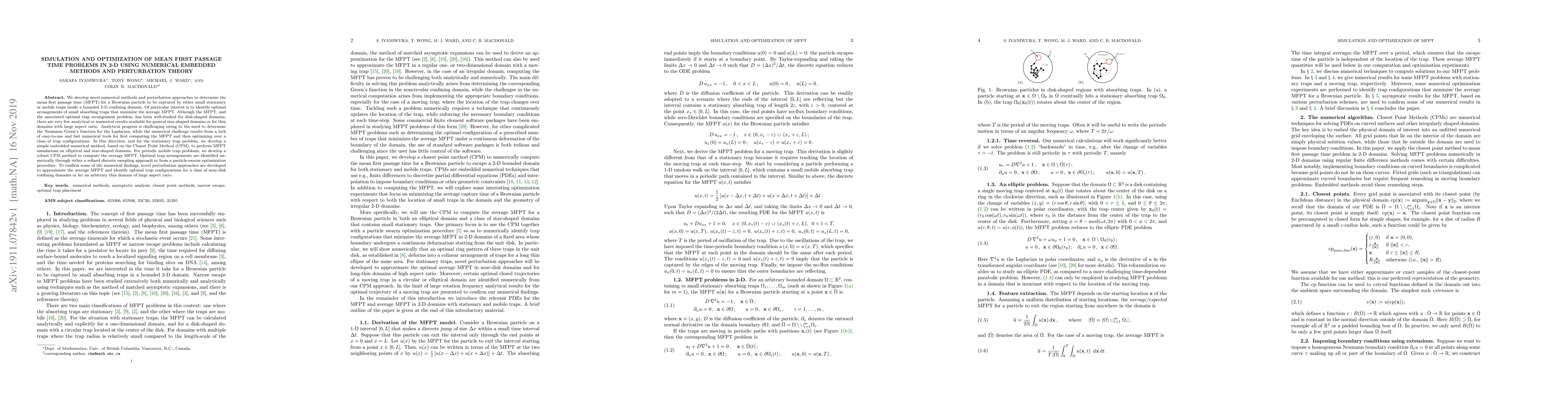 We develop novel numerical methods and perturbation approaches to determine the mean first passage time (MFPT) for a Brownian particle to be captured by either small stationary or mobile traps inside a bounded 2-D confining domain. Of particular interest is to identify optimal arrangements of small absorbing traps that minimize the average MFPT. Although the MFPT, and the associated optimal trap arrangement problem, has been well-studied for disk-shaped domains, there are very few analytical or numerical results available for general star-shaped domains or for thin domains with large aspect ratio. Analytical progress is challenging owing to the need to determine the Neumann Green's function for the Laplacian, while the numerical challenge results from a lack of easy-to-use and fast numerical tools for first computing the MFPT and then optimizing over a class of trap configurations. In this direction, and for the stationary trap problem, we develop a simple embedded numerical method, based on the Closest Point Method (CPM), to perform MFPT simulations on elliptical and star-shaped domains. For periodic mobile trap problems, we develop a robust CPM method to compute the average MFPT. Optimal trap arrangements are identified numerically through either a refined discrete sampling approach or from a particle-swarm optimization procedure. To confirm some of the numerical findings, novel perturbation approaches are developed to approximate the average MFPT and identify optimal trap configurations for a class of near-disk confining domains or for an arbitrary thin domain of large aspect ratio.