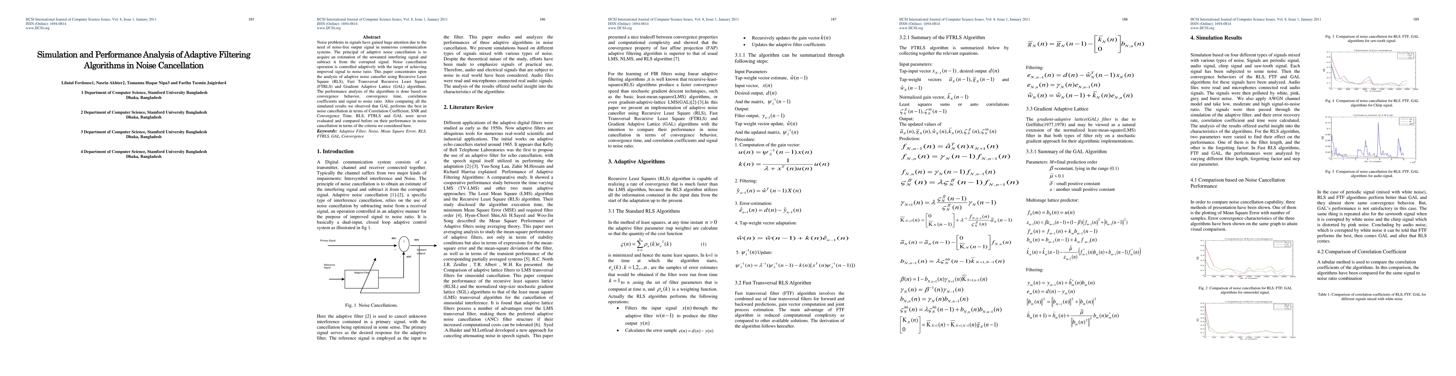 This paper evaluates adaptive filtering algorithms for noise cancellation in communication systems, focusing on RLS, FTRLS, and GAL. The GAL algorithm was found to outperform the others in terms of correlation coefficient, signal-to-noise ratio, and convergence time.