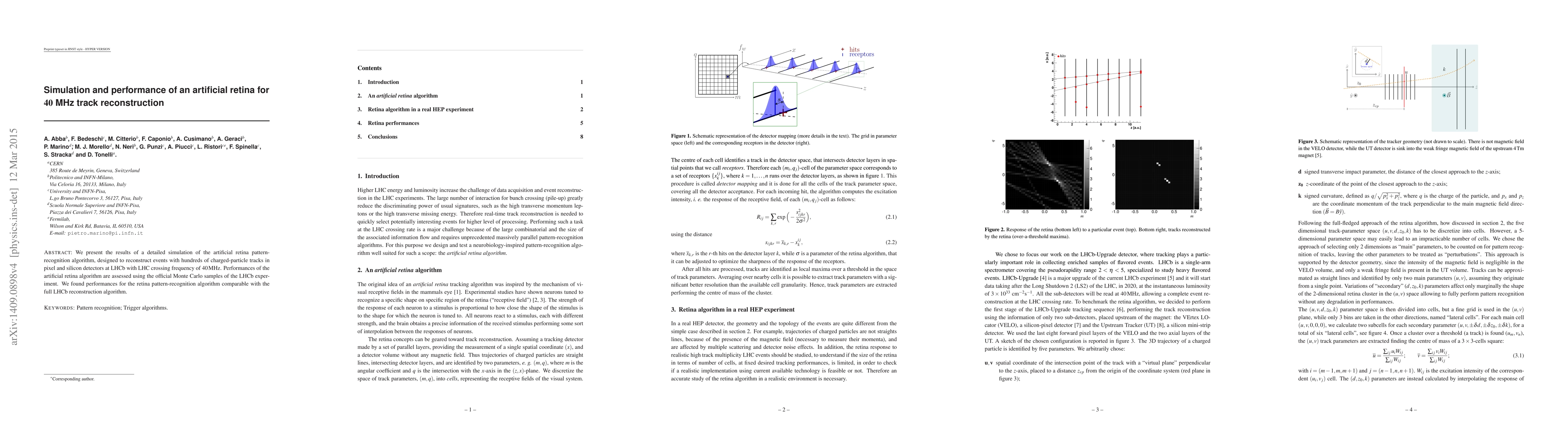 We present the results of a detailed simulation of the artificial retina pattern-recognition algorithm, designed to reconstruct events with hundreds of charged-particle tracks in pixel and silicon detectors at LHCb with LHC crossing frequency of $40\,\rm MHz$. Performances of the artificial retina algorithm are assessed using the official Monte Carlo samples of the LHCb experiment. We found performances for the retina pattern-recognition algorithm comparable with the full LHCb reconstruction algorithm.