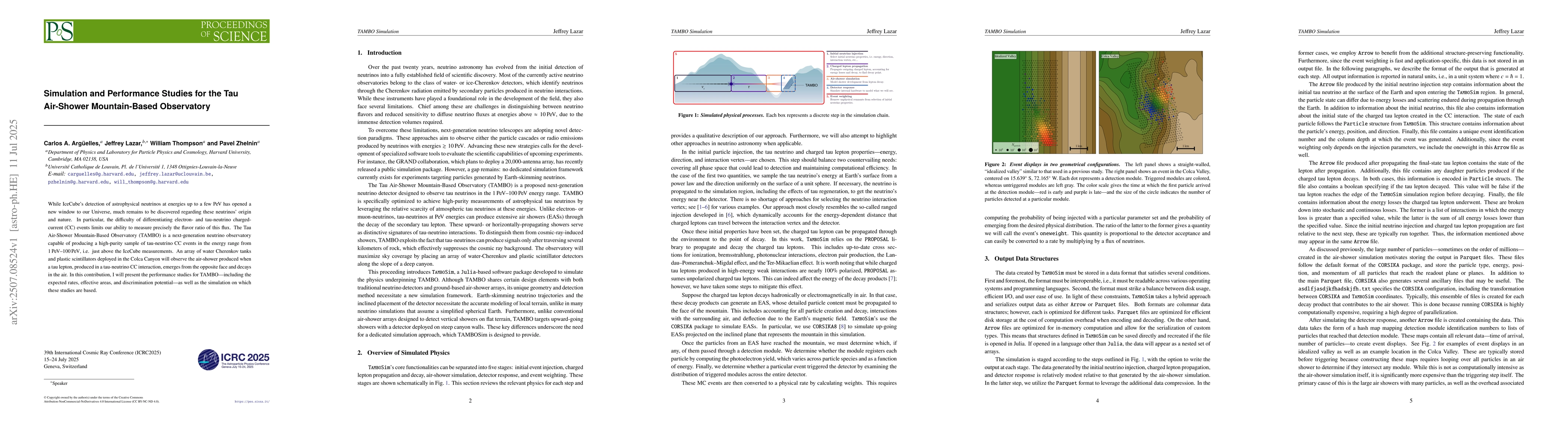 While IceCube's detection of astrophysical neutrinos at energies up to a few PeV has opened a new window to our Universe, much remains to be discovered regarding these neutrinos' origin and nature. In particular, the difficulty of differentiating electron- and tau-neutrino charged-current (CC) events limits our ability to measure precisely the flavor ratio of this flux. The Tau Air-Shower Mountain-Based Observatory (TAMBO) is a next-generation neutrino observatory capable of producing a high-purity sample of tau-neutrino CC events in the energy range from 1 PeV--100 PeV, i.e. just above the IceCube measurements. An array of water Cherenkov tanks and plastic scintillators deployed in the Colca Canyon will observe the air-shower produced when a tau lepton, produced in a tau-neutrino CC interaction, emerges from the opposite face and decays in the air. In this contribution, I will present the performance studies for TAMBO -- including the expected rates, effective areas, and discrimination potential -- as well as the simulation on which these studies are based.