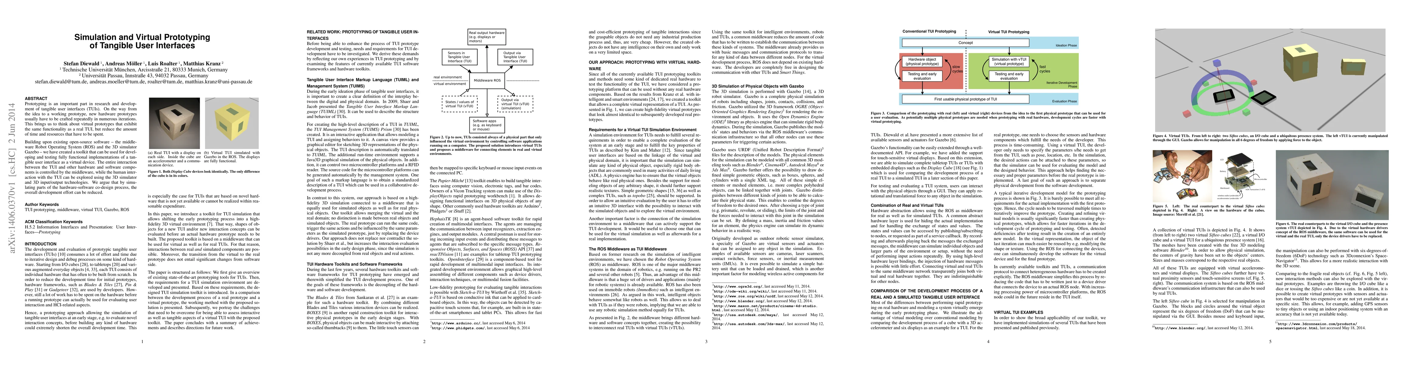 This paper presents a toolkit for simulating and prototyping tangible user interfaces (TUIs) using the Robot Operating System (ROS) and Gazebo simulator, aiming to reduce development time and resources by enabling virtual testing of TUI functionality. The proposed approach leverages virtual prototypes to explore human interaction with TUIs before physical prototypes are built.