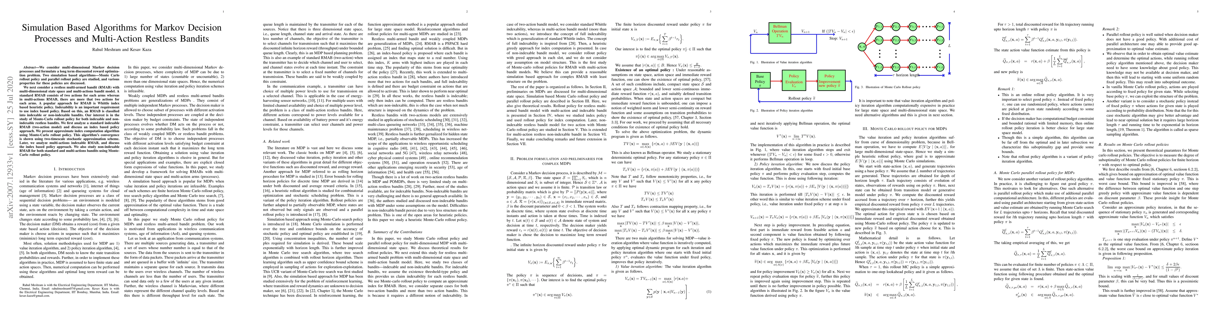 This paper explores simulation-based algorithms for optimizing long-term discounted rewards in multi-dimensional Markov decision processes and multi-action restless bandits. It examines Monte Carlo rollout policies for both indexable and non-indexable restless bandits, presenting an approximate index computation algorithm and analyzing its convergence.