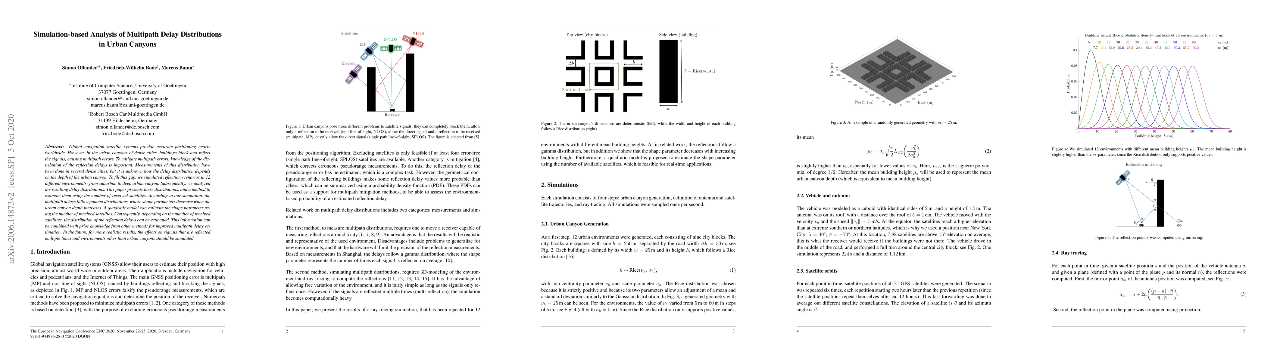 This paper simulates multipath delay distributions in urban canyons to understand how depth affects reflection delays, finding that delays follow gamma distributions with decreasing shape parameters in deeper canyons. A quadratic model estimates these parameters based on the number of received satellites, aiding in improved multipath delay estimation.