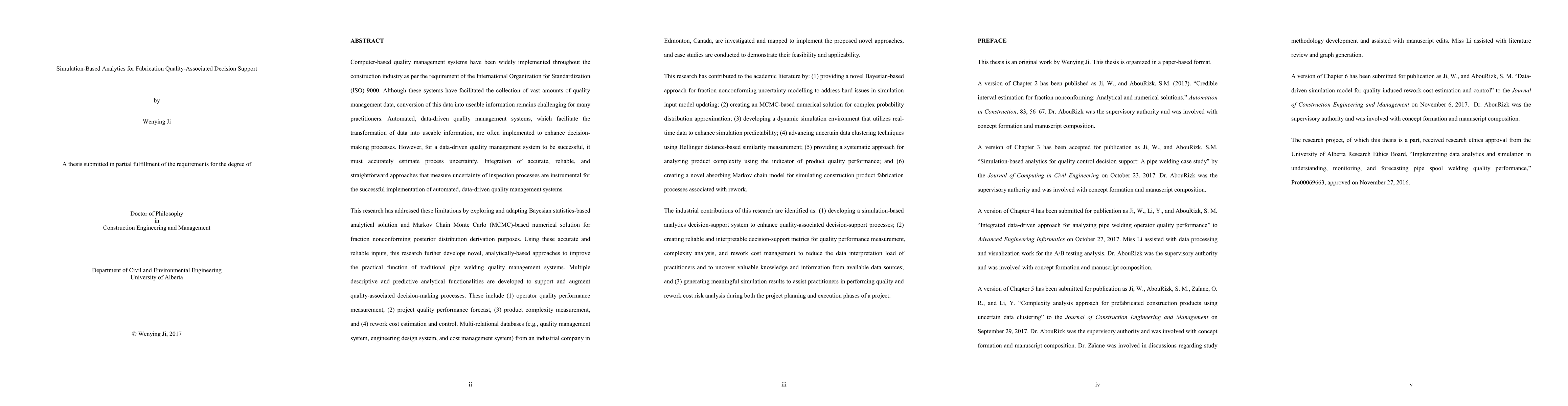 This research develops simulation-based analytics to enhance construction fabrication quality management through Bayesian statistics and integrated analytical methods, aiming to improve decision-making processes and reduce data interpretation burdens for practitioners. The study also creates reliable metrics for quality performance, complexity, and rework cost management.