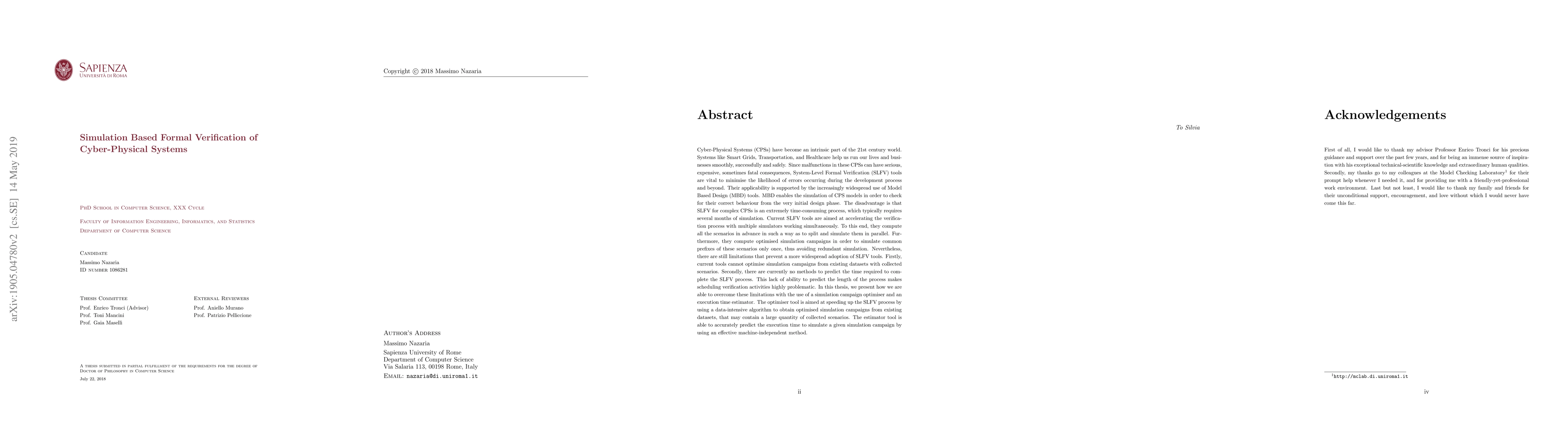 This paper discusses the formal verification of Cyber-Physical Systems (CPSs) using simulation-based methods to minimize errors. It addresses the limitations of current tools, such as inability to optimize from existing datasets and lack of time prediction, and proposes a solution with a data-intensive optimiser and an execution time estimator to improve the efficiency and scheduling of verification processes.