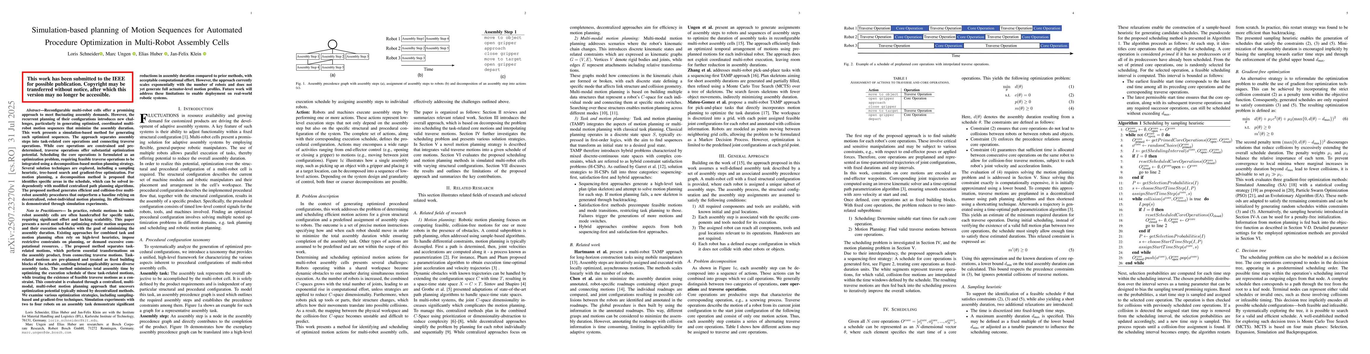 Reconfigurable multi-robot cells offer a promising approach to meet fluctuating assembly demands. However, the recurrent planning of their configurations introduces new challenges, particularly in generating optimized, coordinated multi-robot motion sequences that minimize the assembly duration. This work presents a simulation-based method for generating such optimized sequences. The approach separates assembly steps into task-related core operations and connecting traverse operations. While core operations are constrained and predetermined, traverse operations offer substantial optimization potential. Scheduling the core operations is formulated as an optimization problem, requiring feasible traverse operations to be integrated using a decomposition-based motion planning strategy. Several solution techniques are explored, including a sampling heuristic, tree-based search and gradient-free optimization. For motion planning, a decomposition method is proposed that identifies specific areas in the schedule, which can be solved independently with modified centralized path planning algorithms. The proposed method generates efficient and collision-free multi-robot assembly procedures that outperform a baseline relying on decentralized, robot-individual motion planning. Its effectiveness is demonstrated through simulation experiments.