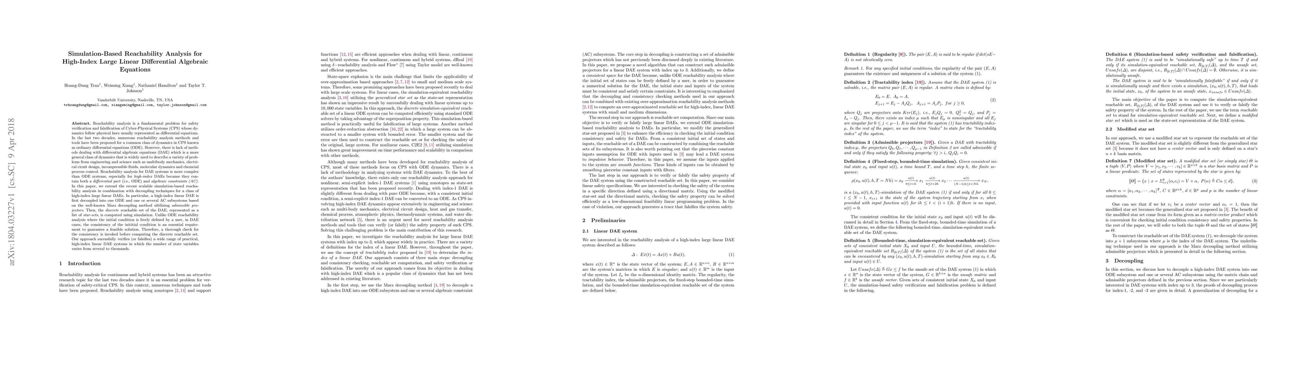 Reachability analysis is a fundamental problem for safety verification and falsification of Cyber-Physical Systems (CPS) whose dynamics follow physical laws usually represented as differential equations. In the last two decades, numerous reachability analysis methods and tools have been proposed for a common class of dynamics in CPS known as ordinary differential equations (ODE). However, there is lack of methods dealing with differential algebraic equations (DAE) which is a more general class of dynamics that is widely used to describe a variety of problems from engineering and science such as multibody mechanics, electrical cicuit design, incompressible fluids, molecular dynamics and chemcial process control. Reachability analysis for DAE systems is more complex than ODE systems, especially for high-index DAEs because they contain both a differential part (i.e., ODE) and algebraic constraints (AC). In this paper, we extend the recent scalable simulation-based reachability analysis in combination with decoupling techniques for a class of high-index large linear DAEs. In particular, a high-index linear DAE is first decoupled into one ODE and one or several AC subsystems based on the well-known Marz decoupling method ultilizing admissible projectors. Then, the discrete reachable set of the DAE, represented as a list of star-sets, is computed using simulation. Unlike ODE reachability analysis where the initial condition is freely defined by a user, in DAE cases, the consistency of the inititial condition is an essential requirement to guarantee a feasible solution. Therefore, a thorough check for the consistency is invoked before computing the discrete reachable set. Our approach sucessfully verifies (or falsifies) a wide range of practical, high-index linear DAE systems in which the number of state variables varies from several to thousands.